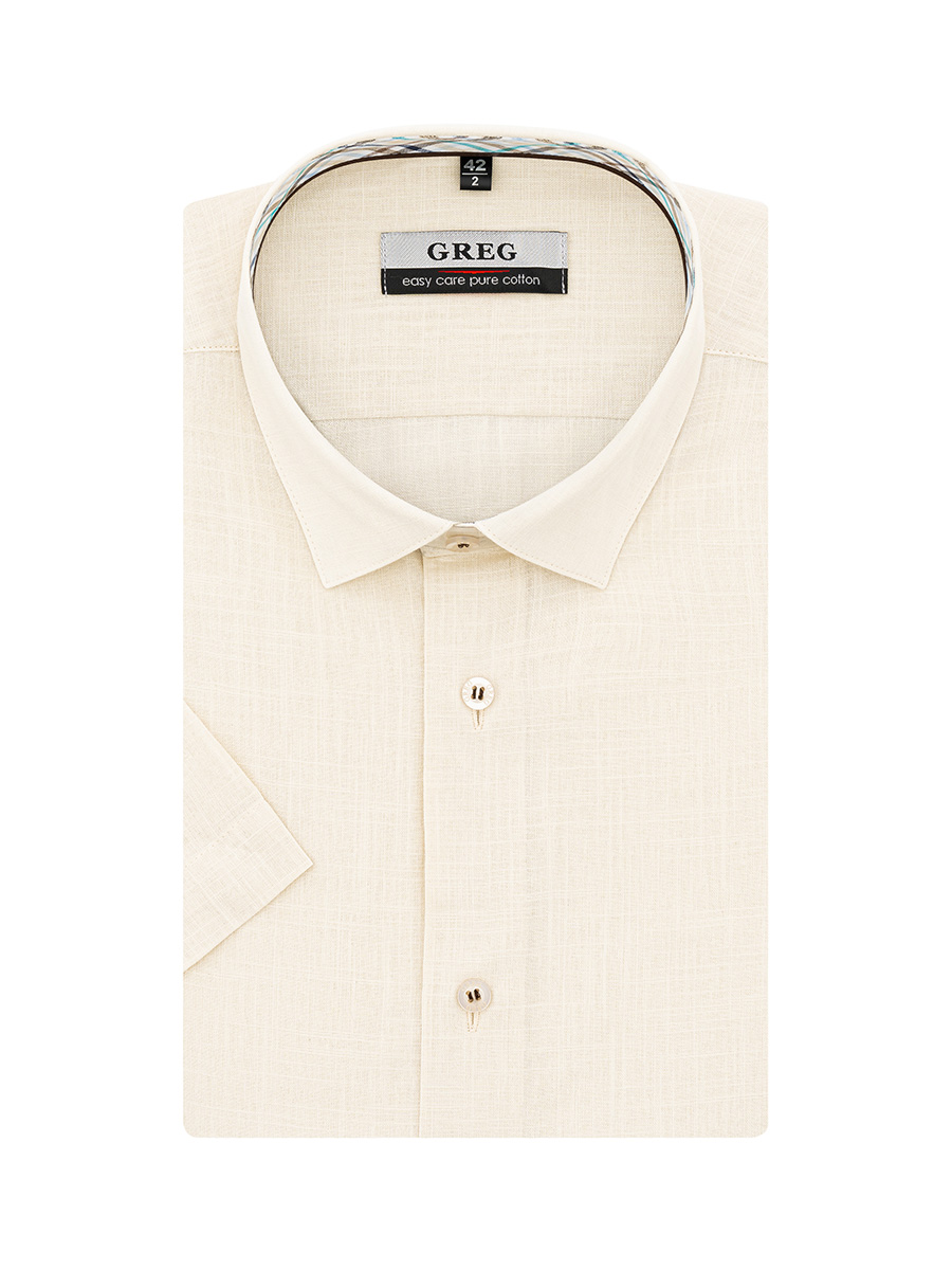 Цвет: Бежевый Рисунок: Однотон с ..показатьфактурой Состав: 100% хлопок Easy Care Модель: Зауженная Ворот: Немецкий мягкий Караман: отсутствует Силуэт: Полуприталенный силуэт / Regular fit Отделка: Сорочки- внутренняя стойка воротника из ткани компаньона по косойфактурой