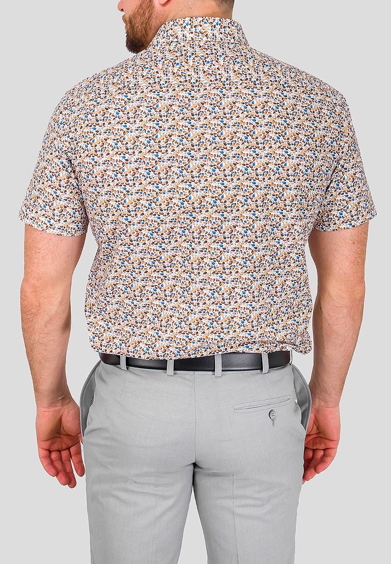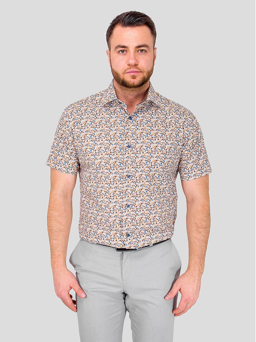 Цвет: Бежевый Рисунок: В мелкие э..показатьлементы Состав: 100% хлопок Модель: Зауженная Ворот: Французский маленький Караман: отсутствует Силуэт: Полуприталенный силуэт / Regular fit Отделка: Сорочки- внутренняя стойка воротника из ткани компаньоналементы