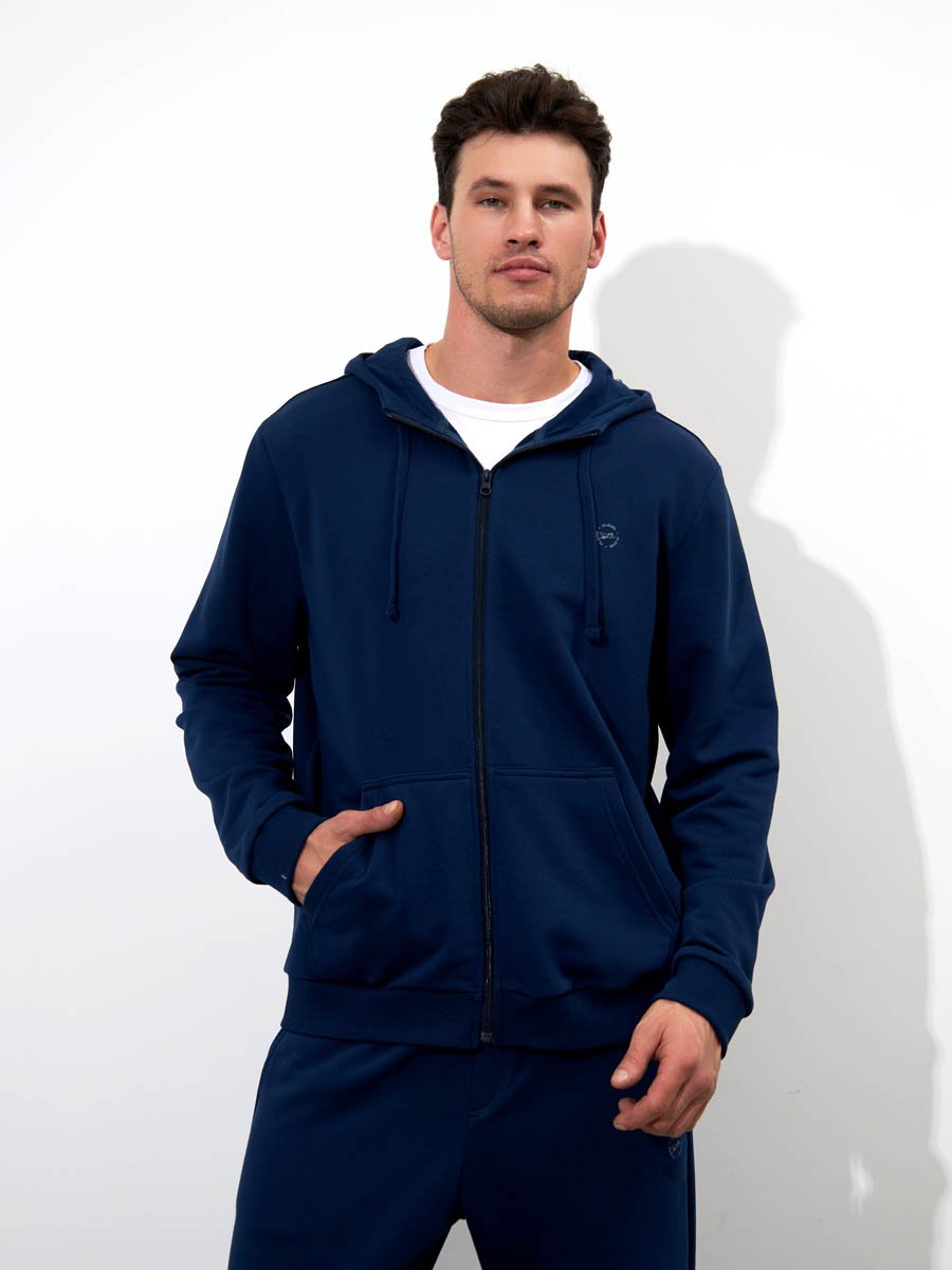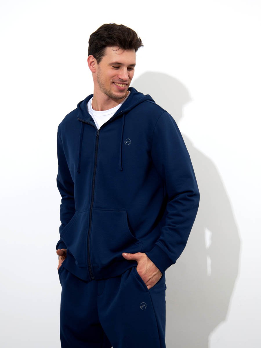 Классическая толстовка на молнии, выполнена из хлопкового полотна с добавлением полиэстера. Мягкая и приятная на ощупь, обладает хорошей гигроскопичностью, позволяет коже дышать. Модель с капюшоном и длинными рукавами не сковывает движений,  обеспечивая комфорт. Объем капюшона регулируется при помощи шнура. Манжеты рукавов и низ толстовки оснащены эластичными резинками. Спереди толстовка дополнена карманом "кенгуру".