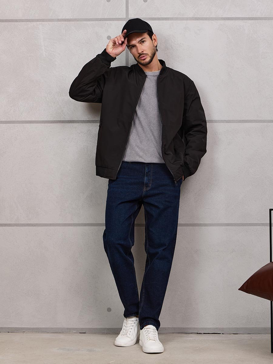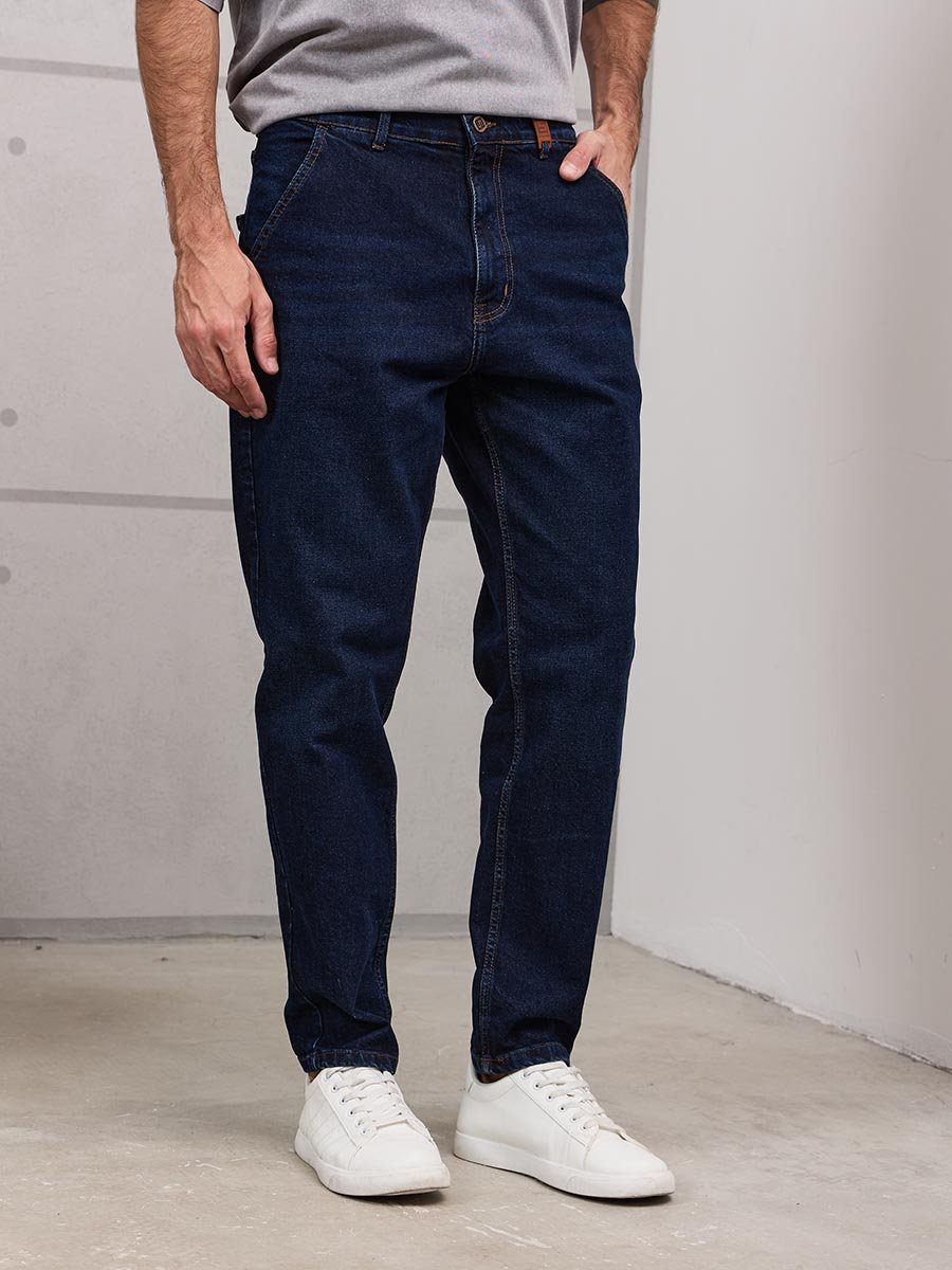 Мужские комфортные модные джинсы "Бананы" с пятью карманами. Для удобства боковые карманы джинсов сделаны косыми , т.е.  карманы  "хулиганы".  Высокая талия, свободные по бедрам и бедру и узкие внизу. Застежка на молнии. Выполнены из слабоэластичной ткани denim comfort stretch. Классическая темная  стирка "stone wash" со слабовыраженными потёртостями и "усами" спереди и потёртостями сзади.