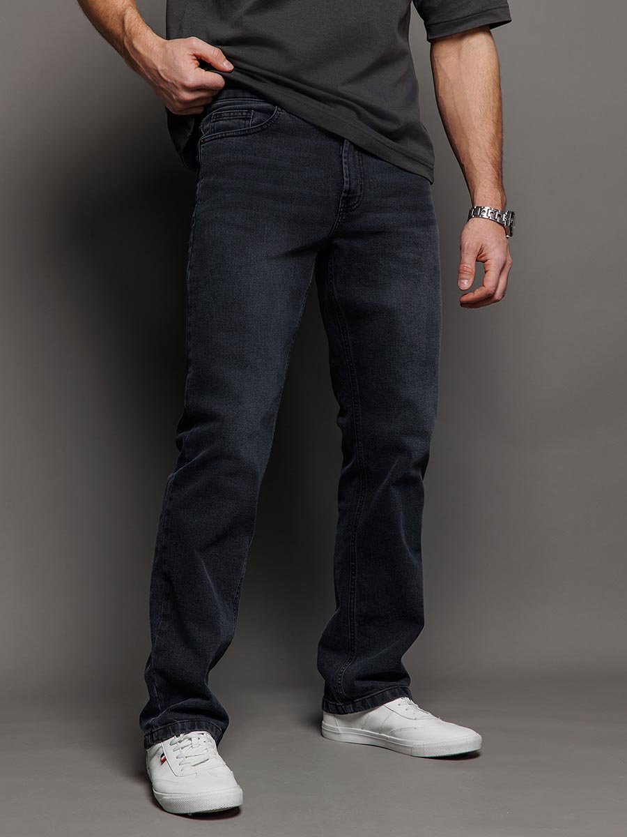 Мужские классические джинсы с пятью карманами. Посадка Regular fit (полуоблегающие по бедру), высокая талия. Застежка на молнии. Немного заужены в колене и по низу. Выполнены из  толстой слабоэластичной ткани denim comfort stretch цвет ткани Black/Black (лицевая и изнаночная стороны ткани черные). Темная стирка с потёртостями и "усами" спереди и потёртостями сзади.