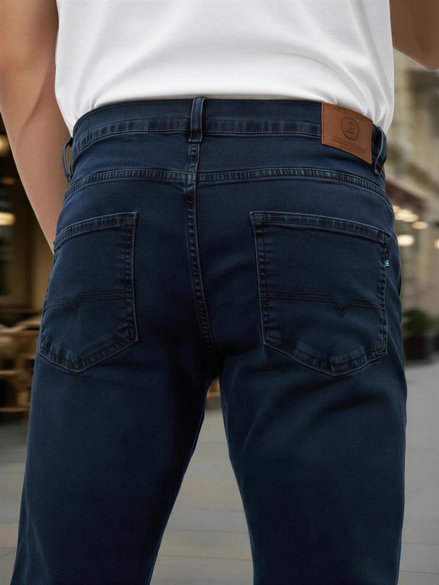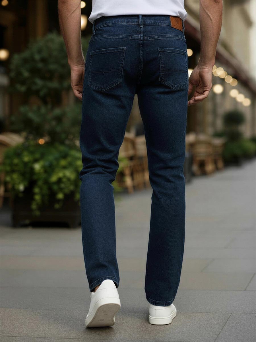Мужские классические джинсы с пятью карманами. Посадка Slim fit (облегающие по бедру), средняя высота талии. Застежка на молнии. Немного зауженные к низу. Выполнены из эластичной ткани denim stretch, цвет ткани Blue/Black(лицевая сторона ткани темно-синяя, изнаночная сторона- черная). Темная стирка "stone wash" со слабовыраженными потертостями и "усами" спереди и потёртостями сзади.