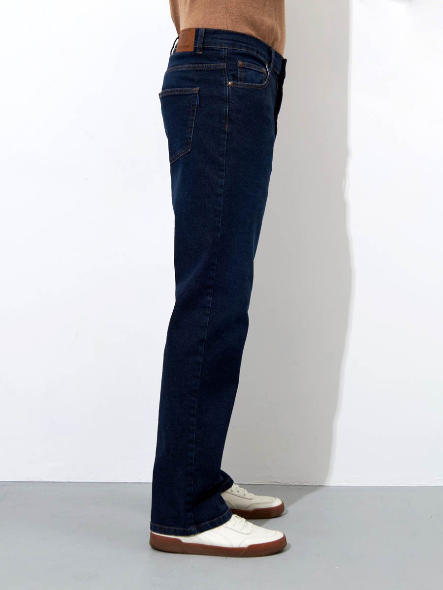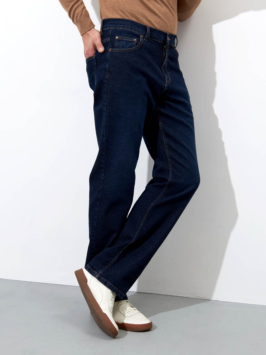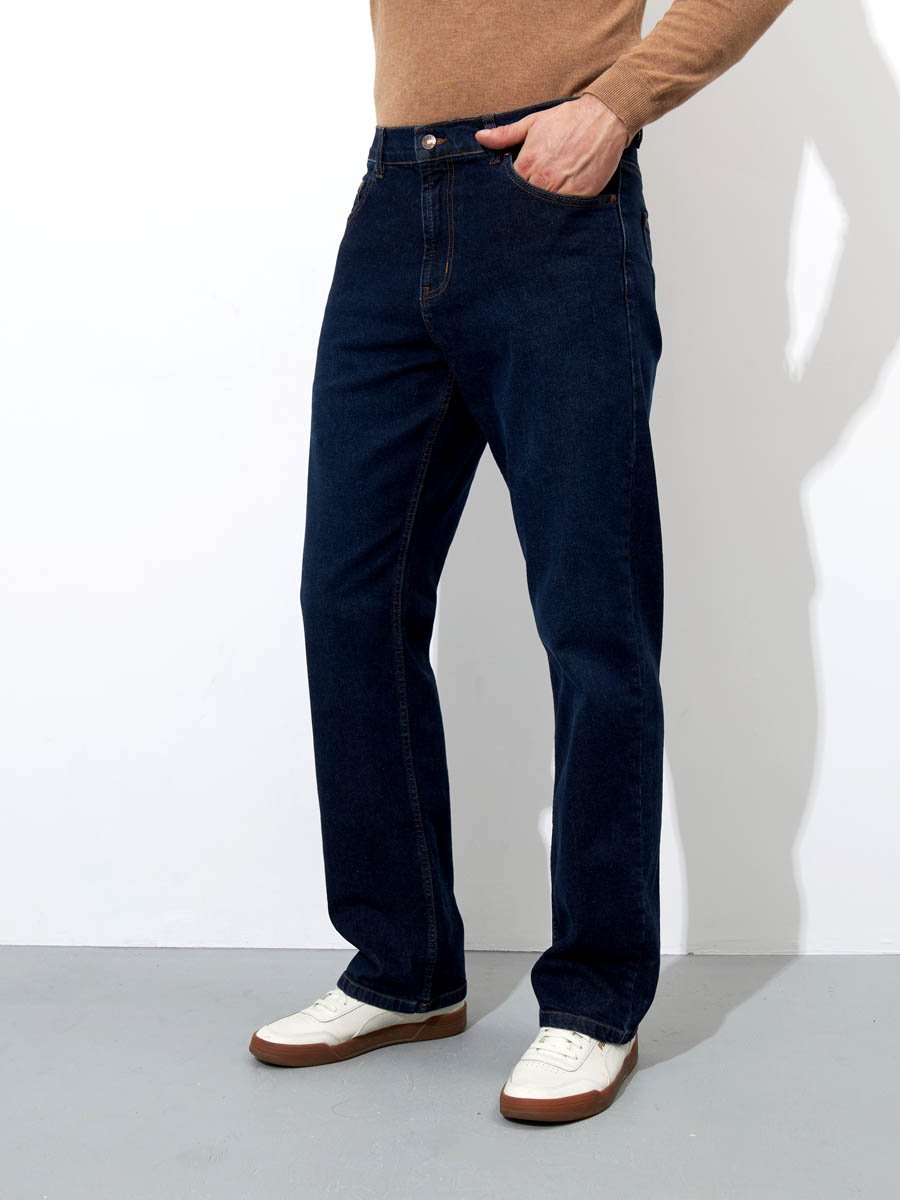 Мужские классические джинсы с пятью карманами. Посадка Comfort fit (свободные по бедру), высокая талия, широкие в колене и по низу. Застежка на молнии. Выполнены из слабоэластичной ткани denim comfort stretch. Темная стирка с камнями (stone wash).