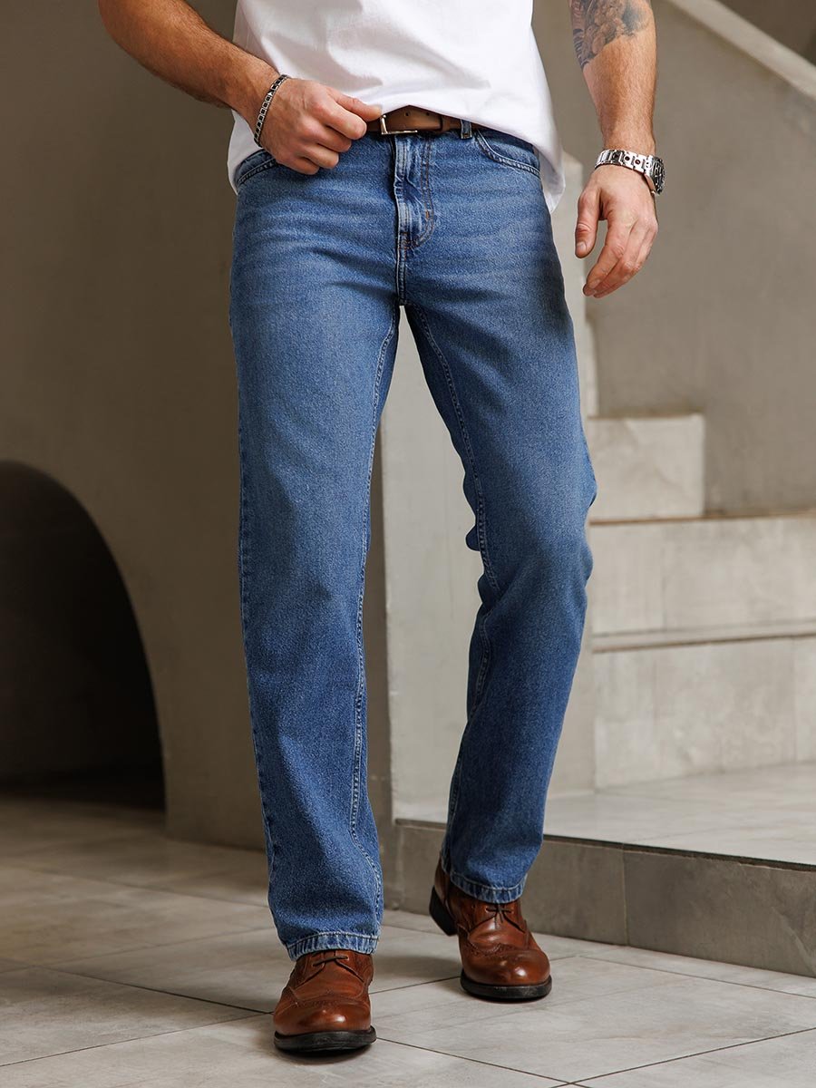 Мужские классические джинсы с пятью карманами. Посадка Regular fit (полуоблегающие по бедру), высокая талия. Застежка на молнии. Немного зауженные к низу. Выполнены из традиционной хлопковой ткани denim. Средняя стирка с потёртостями и "усами" спереди и потёртостями сзади.