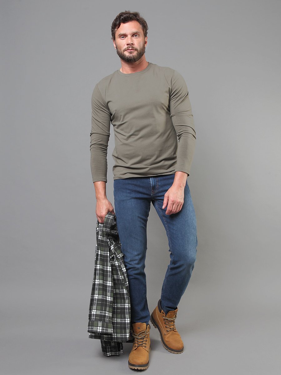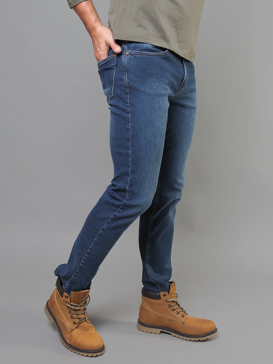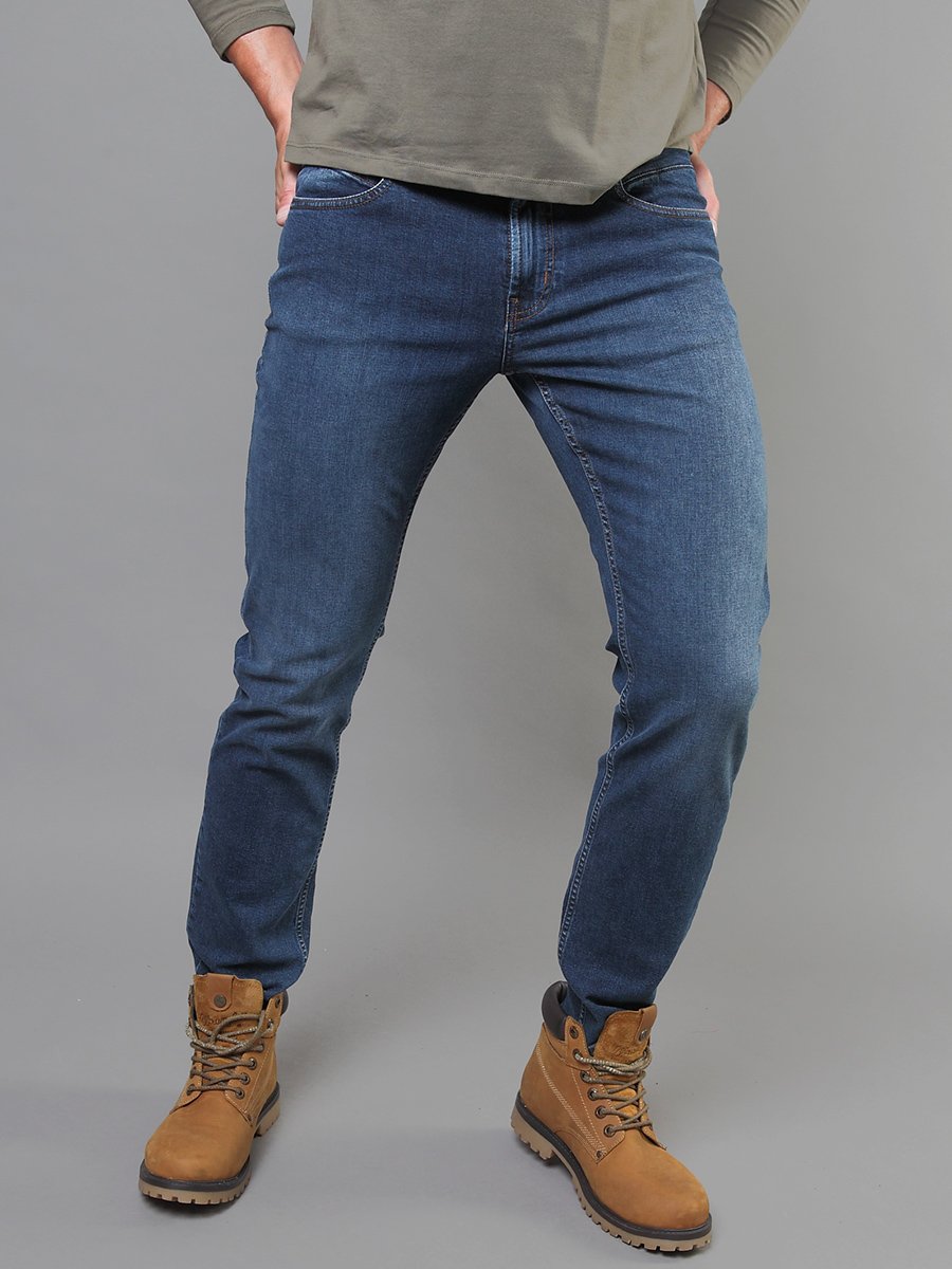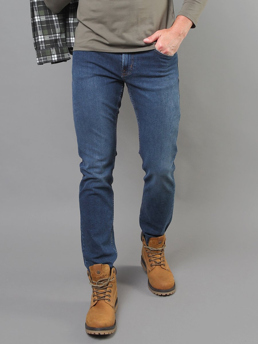 Мужские модные джинсы с пятью карманами. Посадка Regular fit (полуоблегающие по бедру), конструкция бокового шва прямая - Straight cut. Низкая высота талии спереди и высокая сзади. Застежка на молнии. Зауженные к низу. Выполнены из эластичной ткани denim stretch. Средняя стирка с потёртостями спереди и сзади. Параметры указаны для размера 32. Длина внутреннего шва - 82,0 см.