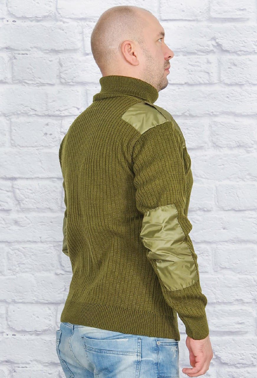 Практичный армейский свитер с высоким горлом связан из толстой полушерстяной пряжи. Крупная вязка обеспечивает хорошую теплоизоляцию, а натуральные волокна пряжи, поглощает влагу и сохраняют кожу сухой. Для защиты от протирания на изделие нашиты тканевые вставки на плечах и рукавах, а нагрудный карман добавляет одежде удобство и практичность.