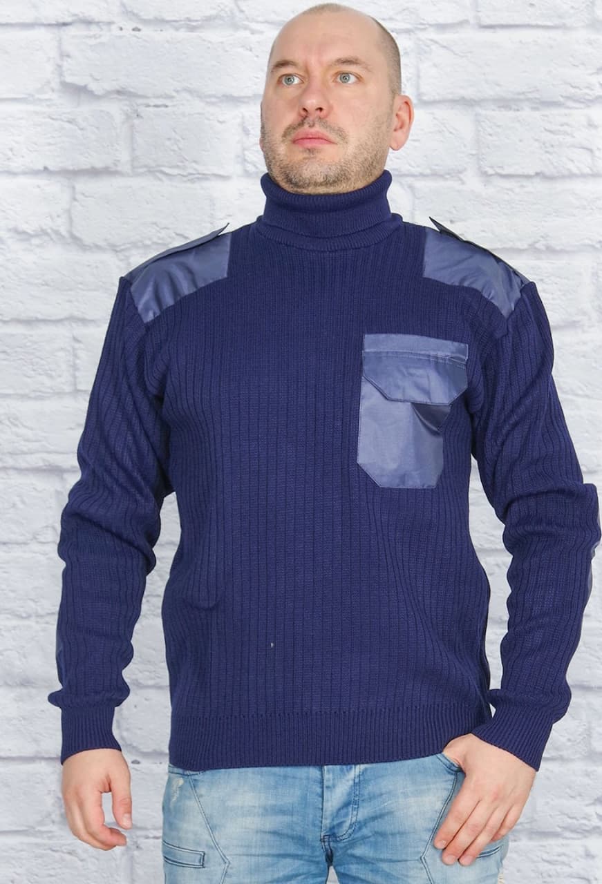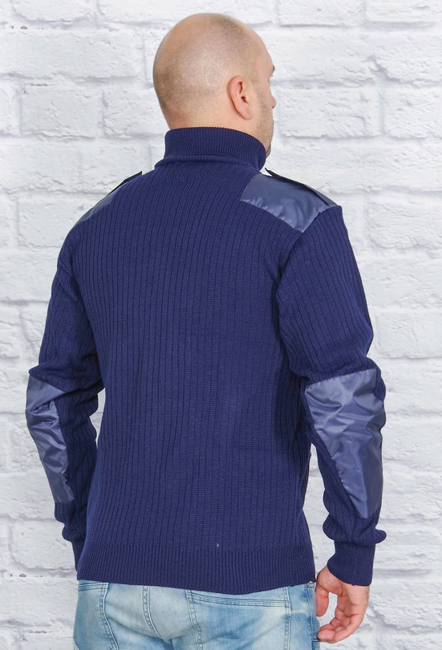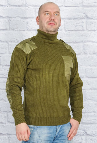 Практичный армейский свитер с высоким горлом связан из толстой полушерстяной пряжи. Крупная вязка обеспечивает хорошую теплоизоляцию, а натуральные волокна пряжи, поглощает влагу и сохраняют кожу сухой. Для защиты от протирания на изделие нашиты тканевые вставки на плечах и рукавах, а нагрудный карман добавляет одежде удобство и практичность.