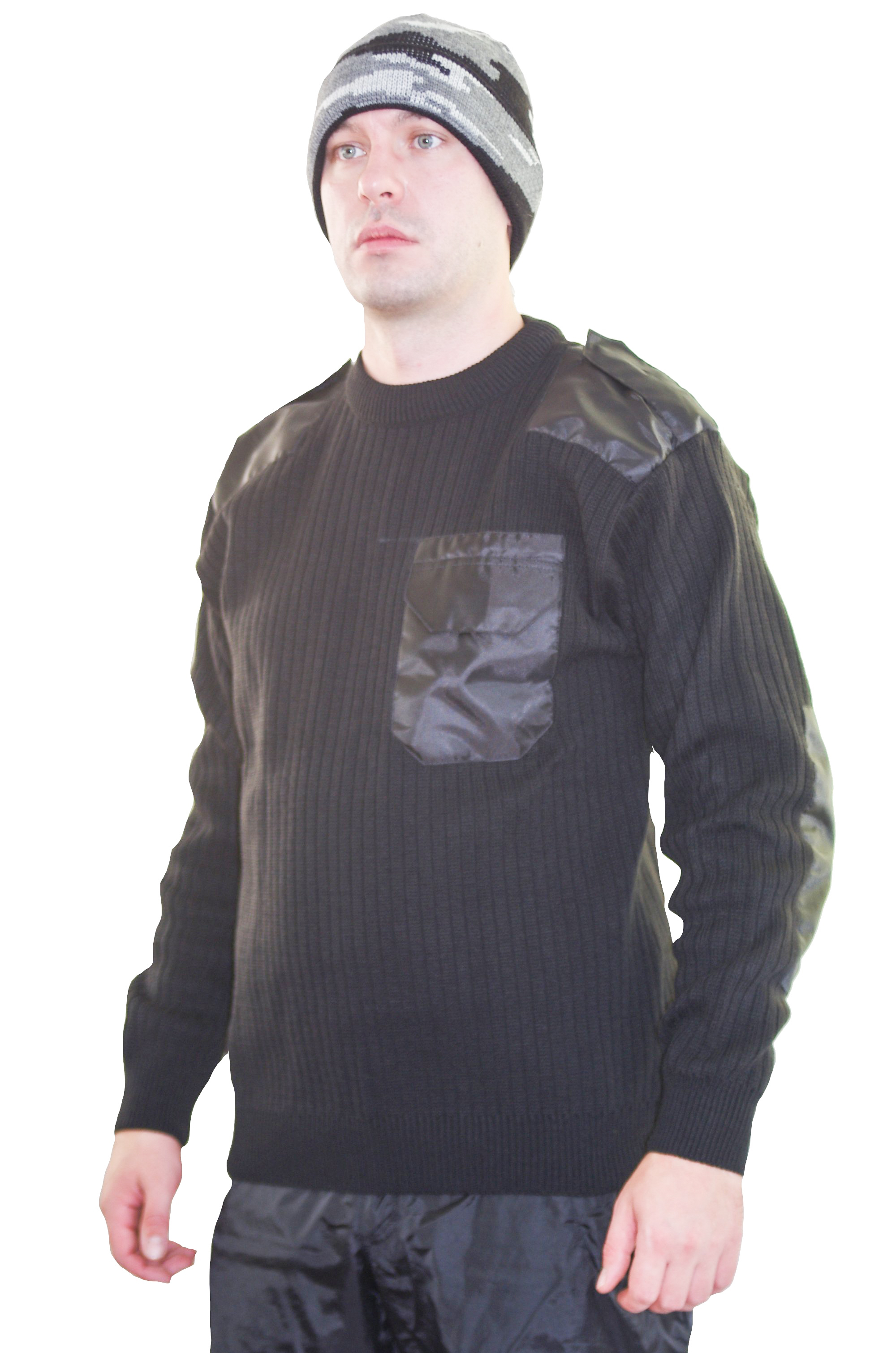 Практичный армейский свитер с округлым вырезом горловины, связан из толстой полушерстяной пряжи содержащей 30% шерсти и 70% акрила. Крупная вязка обеспечивает хорошую теплоизоляцию, а натуральные волокна пряжи, поглощает влагу и сохраняют кожу сухой. Для защиты от протирания на изделие нашиты тканевые вставки на плечах и рукавах, а нагрудный карман добавляет одежде удобство и практичность.