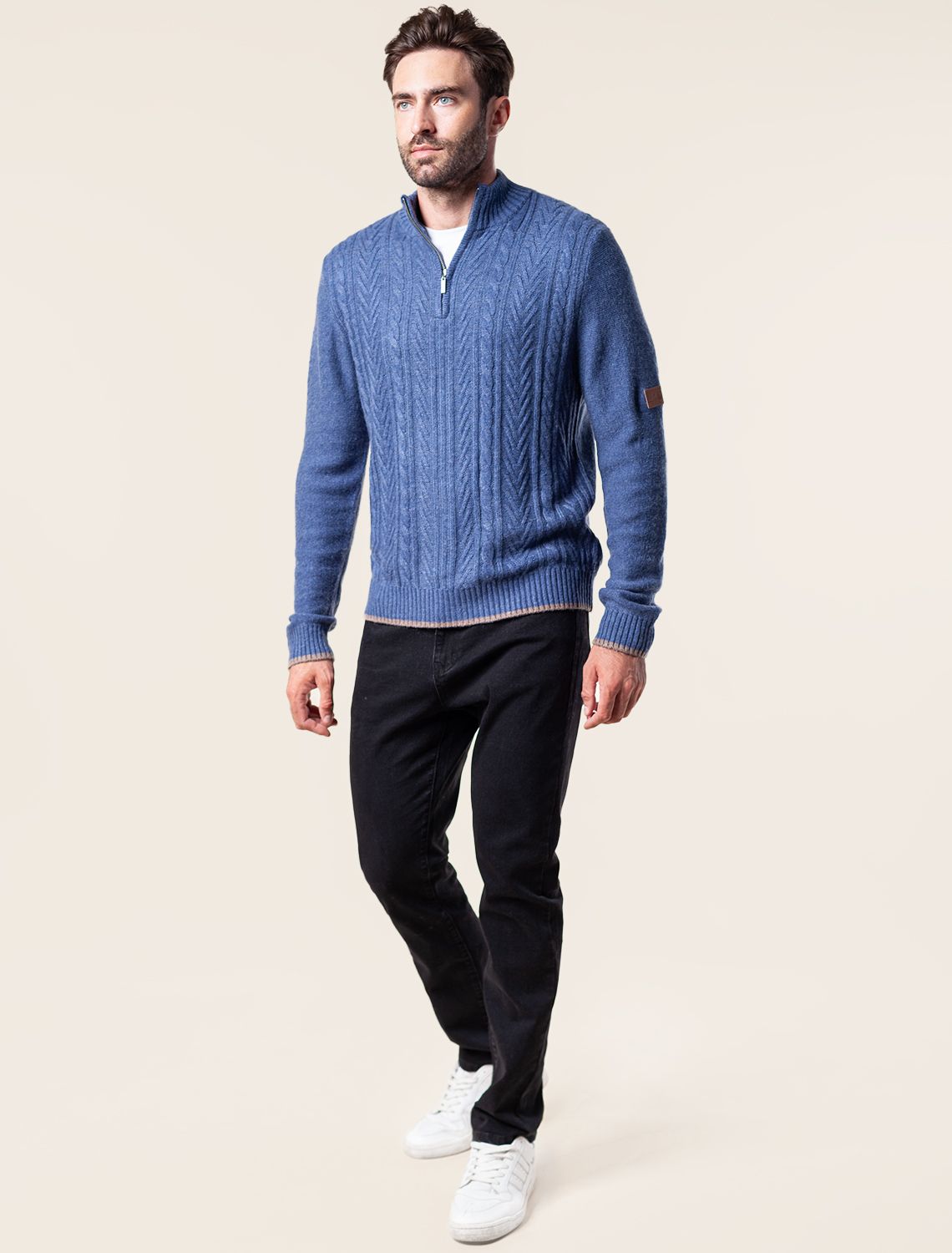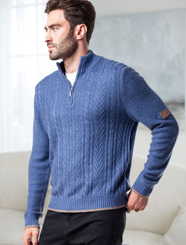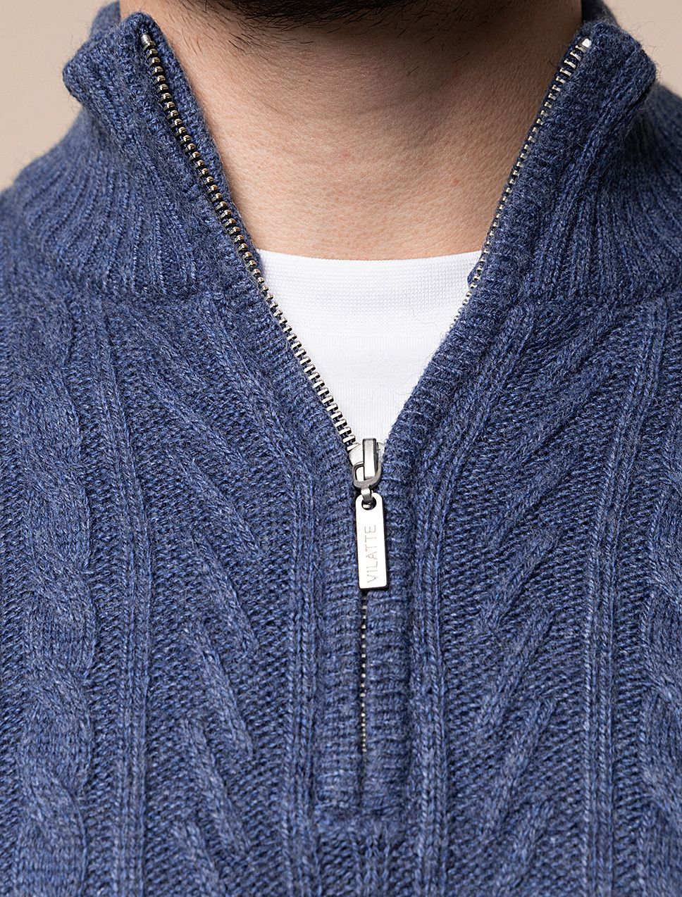 Свитер фактурной крупной вязки с узором косы дополнен металлической молнией на вороте. Модель выполнена их теплой пряжи с шерстью. Отлично держит тепло, при этом не перегревая. Дополнит как повседневный образ, так и нестрогий офисный комплект, с рубашками, футболками или водолазкой. На рукаве изделия нашивка бренда из эко-кожи.