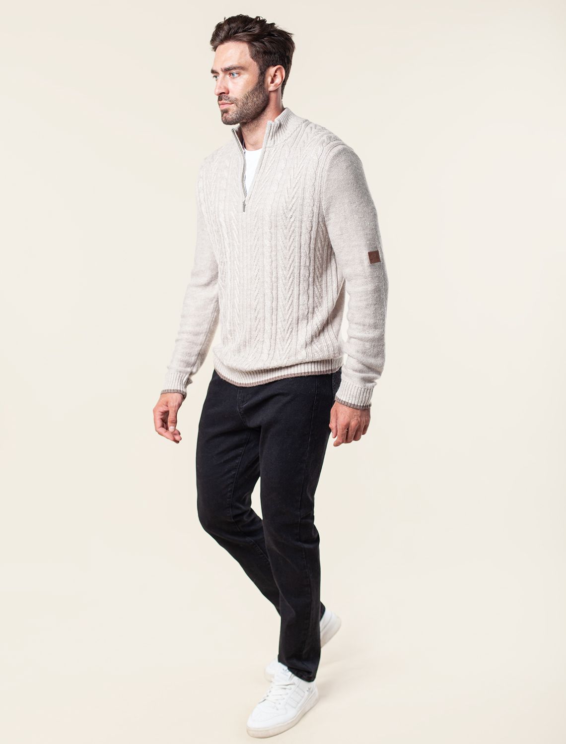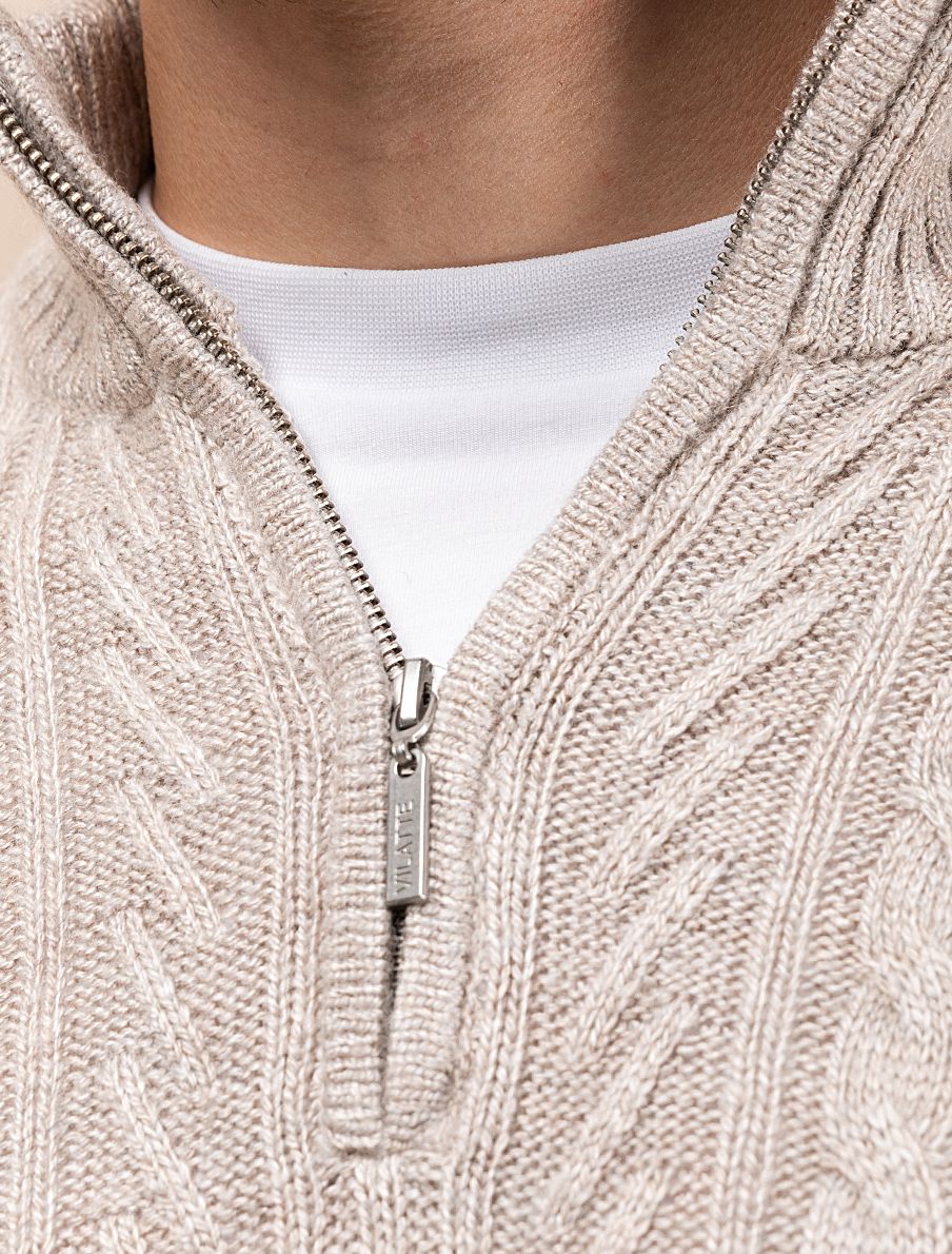Свитер фактурной крупной вязки с узором косы дополнен металлической молнией на вороте. Модель выполнена их теплой пряжи с шерстью. Отлично держит тепло, при этом не перегревая. Дополнит как повседневный образ, так и нестрогий офисный комплект, с рубашками, футболками или водолазкой. На рукаве изделия нашивка бренда из эко-кожи.