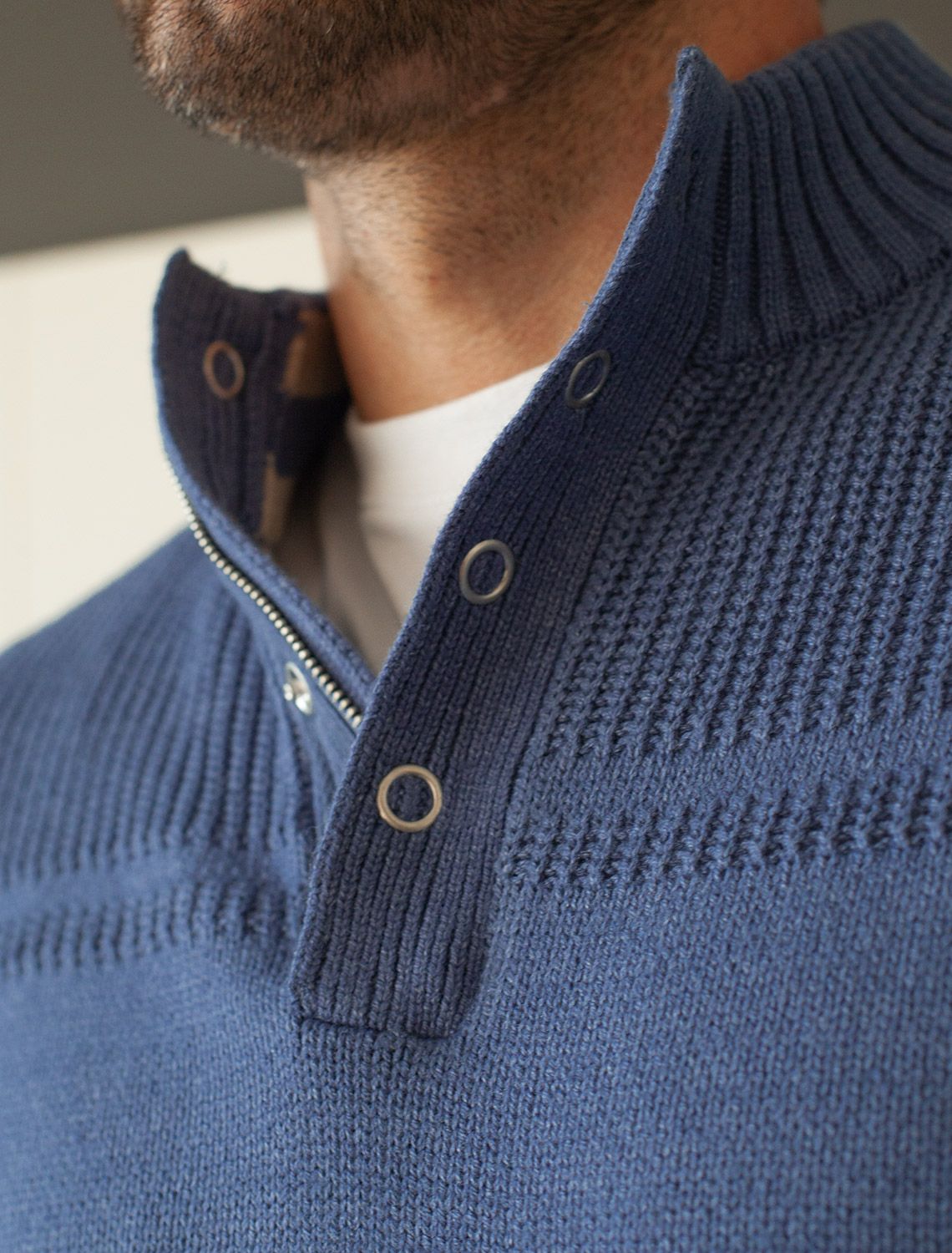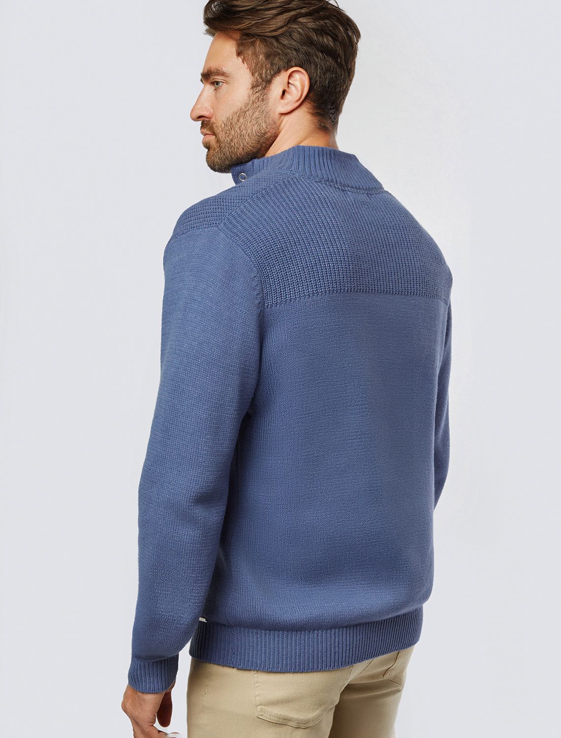 Свитер фактурной вязки с застежкой на крупные кнопки выполнен из мягкой хлопковой пряжи с добавлением акрила. Модель из такого материала не препятствует циркуляции воздуха, но при этом хорошо сохраняет тепло и не колется, поэтому ее комфортно носить на голое тело. С помощью кнопок можно регулировать высоту воротника и носить свитер по-разному. Внизу изделия нашивка бренда из эко-кожи.