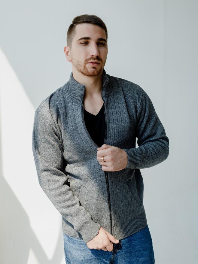 Теплая, вязаная кофта-жакет на молнии, незаменимая вещь в гардеробе мужчины в холодное время года. Вязка плотная. Есть два глубоких кармана. По низу изделия резинка. Рукава на манжетах. Воротник высокий. Максимально комфортный как в использовании, так и в уходе. Рекомендована ручная или машинная стирка при температуре 30 градусов С, в режиме стирки изделий из шерсти с использованием средства для стирки шерстяных изделий.