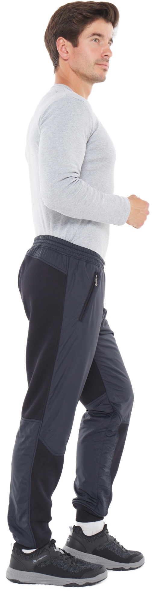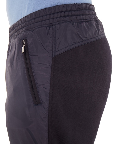 Трикотажные брюки с поясом на резинке. Для дополнительной фиксации в пояс с внутренней стороны вставлен шнурок. Брючины заужены книзу и заканчиваются манжетами. Пояс, задняя кокетка, брючины до колен декорированы нейлон таффетой в тон основного материала. Передние карманы на молниях в рамку.