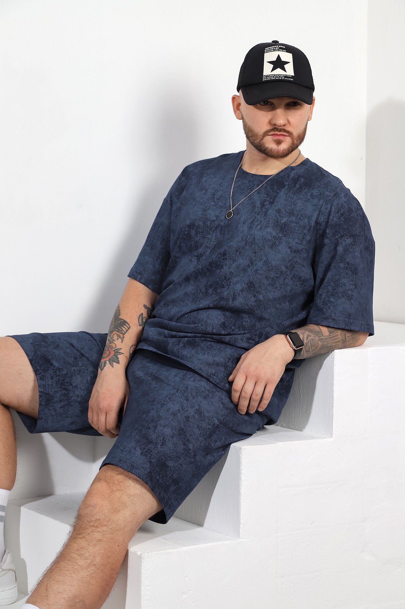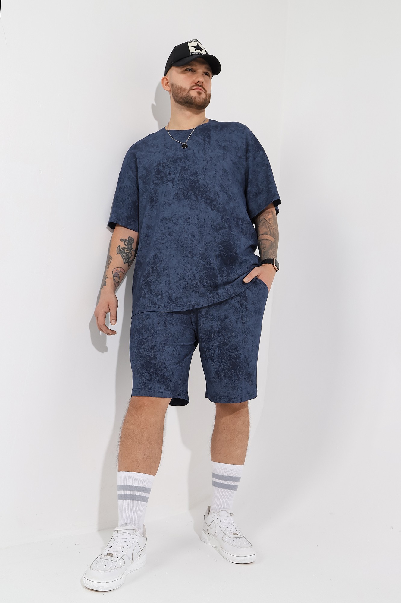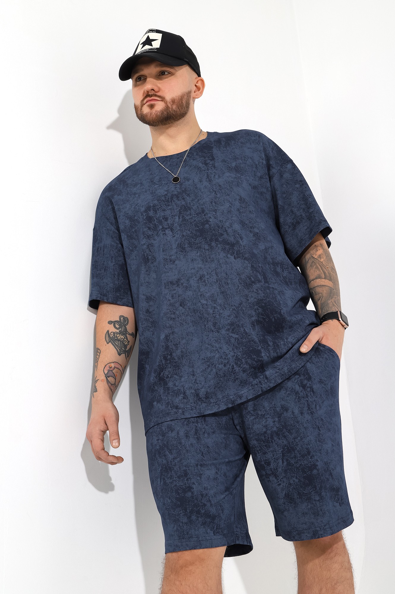 Костюм мужской, состоящий из футболки и шорт. Футболка - свободного покроя, короткими втачными рукавами и горловиной овальной формы, обработанной втачной планкой. По шву втачивания планки настрочена двойная отделочная строчка. Шорты - удлиненные, с карманами в боковых швах, на притачном поясе с эластичной тесьмой внутри.
