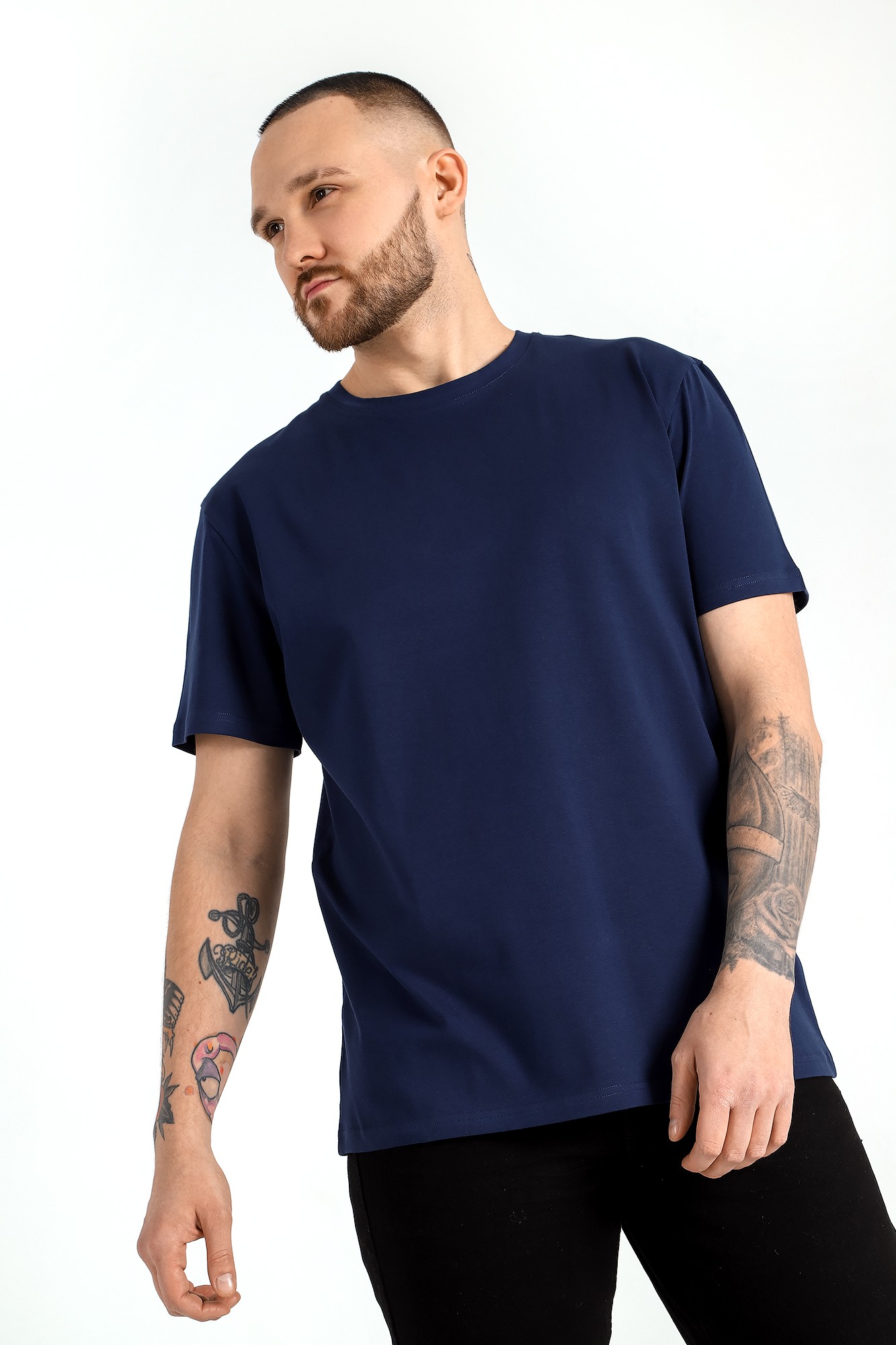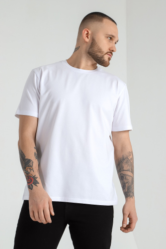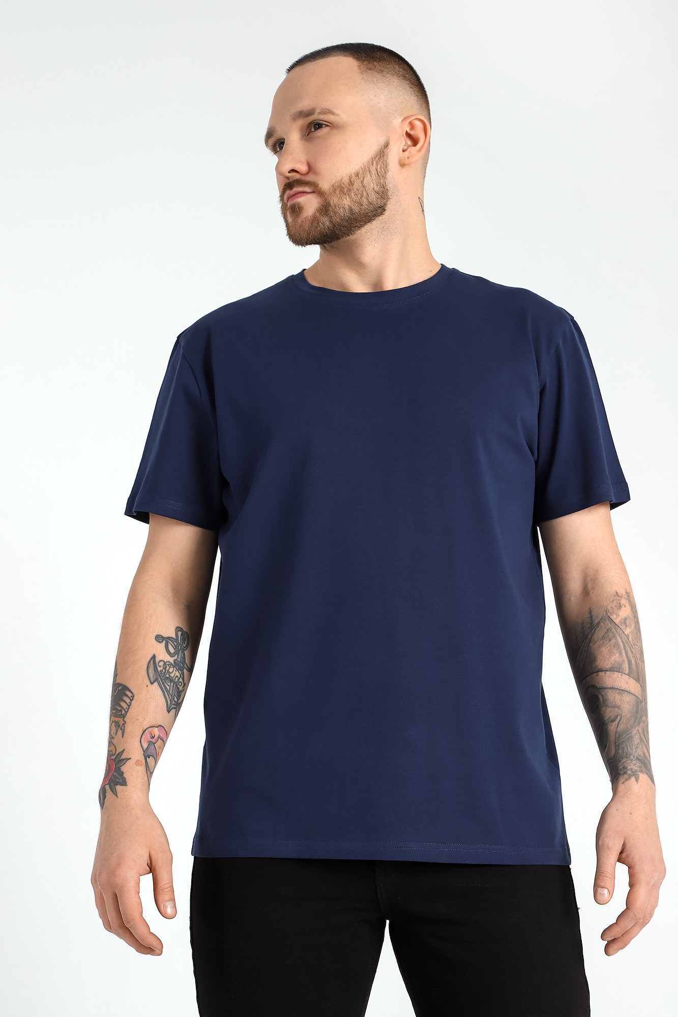 Базовая однотонная мужская футболка прямого силуэта без принта. Выполнена из трикотажного полотна: хлопкового с добавлением лайкры. Горловина округлой формы с усилителем горловины спинки.