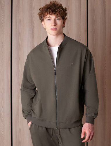 Бомбер выполнен из футера двухнитки с эластаном. Застежка на молнию с наконечником из эко-кожи. Спереди лаконичная вышивка с буквой V в тон изделия. Модель дополнена карманами и фирменным металлическим логотипом бренда. Сочетается в костюме с брюками U44.005