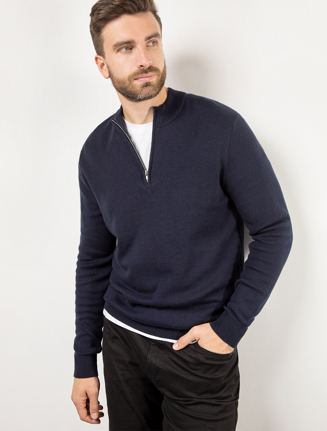 Для изготовления светло-синего джемпера с воротом, застегивающимся на молнию, использовали мягкий трикотаж, связанный из премиального хлопка с добавлением акрила. Двуслойное жаккардовым плетение, вязка с фактурой типа «пике», благодаря чему джемпер имеет среднюю плотность, эластичноть и, при этом, формоустойчивость. Греет за счет иск.шерсти (ПАН) в составе, а премиальный хлопок помогает защитить изделие от скатывания. Такой состав гигроскопичен, греет, но абсолютно не колет
