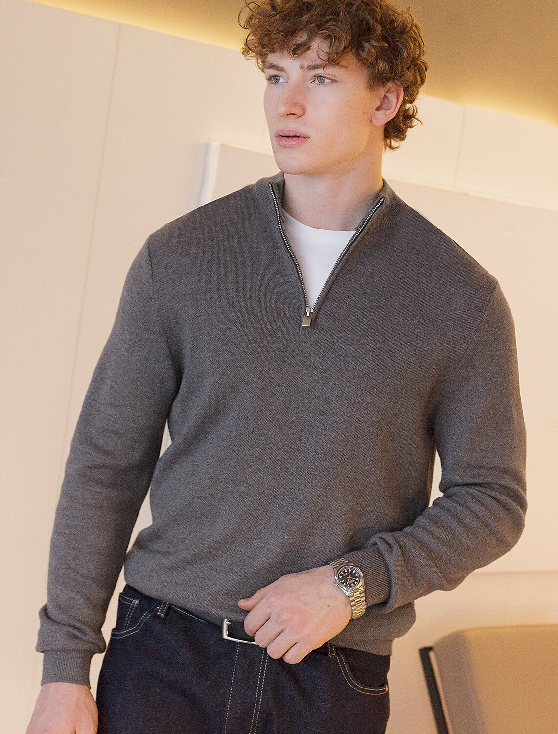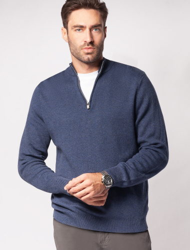 Для изготовления светло-синего джемпера с воротом, застегивающимся на молнию, использовали мягкий трикотаж, связанный из премиального хлопка с добавлением акрила. Двуслойное жаккардовым плетение, вязка с фактурой типа «пике», благодаря чему джемпер имеет среднюю плотность, эластичноть и, при этом, формоустойчивость. Греет за счет иск.шерсти (ПАН) в составе, а премиальный хлопок помогает защитить изделие от скатывания. Такой состав гигроскопичен, греет, но абсолютно не колет