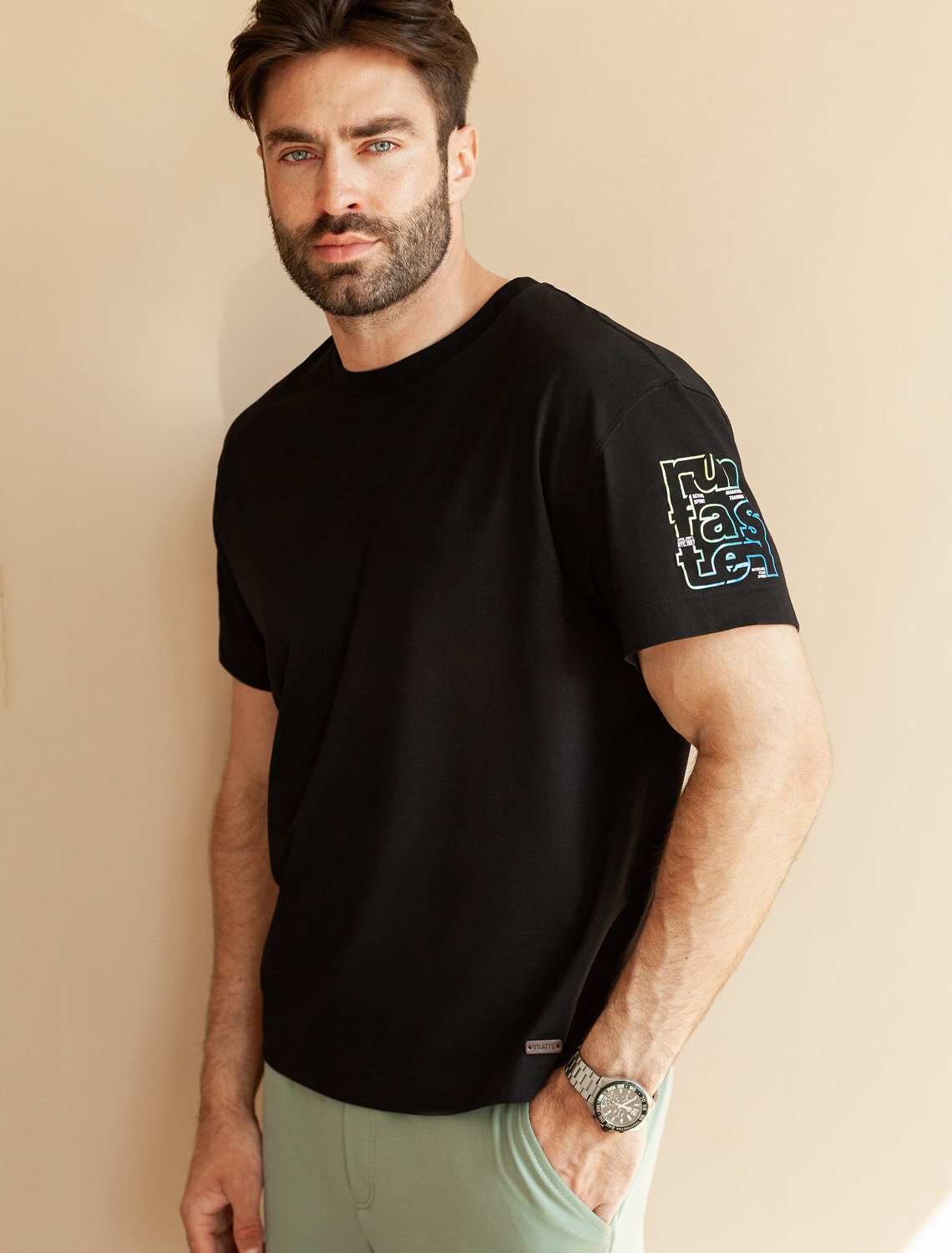 Перевод принта: Run faster, active sport, marathon training, alt dept NYC 1987 - беги быстрее, активный спорт, подготовка к марафону, спортивный колледж Нью-Йорк 1987. Футболка свободного кроя выполнена из премиального хлопка. Авторский принт нанесен красками с устойчивым покрытием. Благодаря эластану, носить изделие очень комфортно, и оно сохранит свой безупречный вид в течение долгого времени. На рукаве нашивка из эко-кожи с логотипом бренда.
