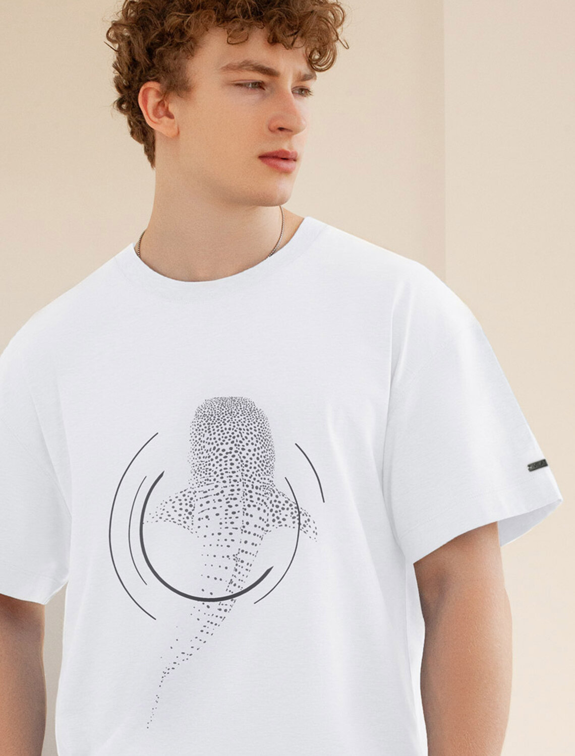 Футболка свободного кроя выполнена из премиального хлопка. Авторский принт нанесен красками с устойчивым покрытием. Благодаря эластану, носить изделие очень комфортно, и оно сохранит свой безупречный вид в течение долгого времени. На рукаве нашивка из эко-кожи с логотипом бренда.