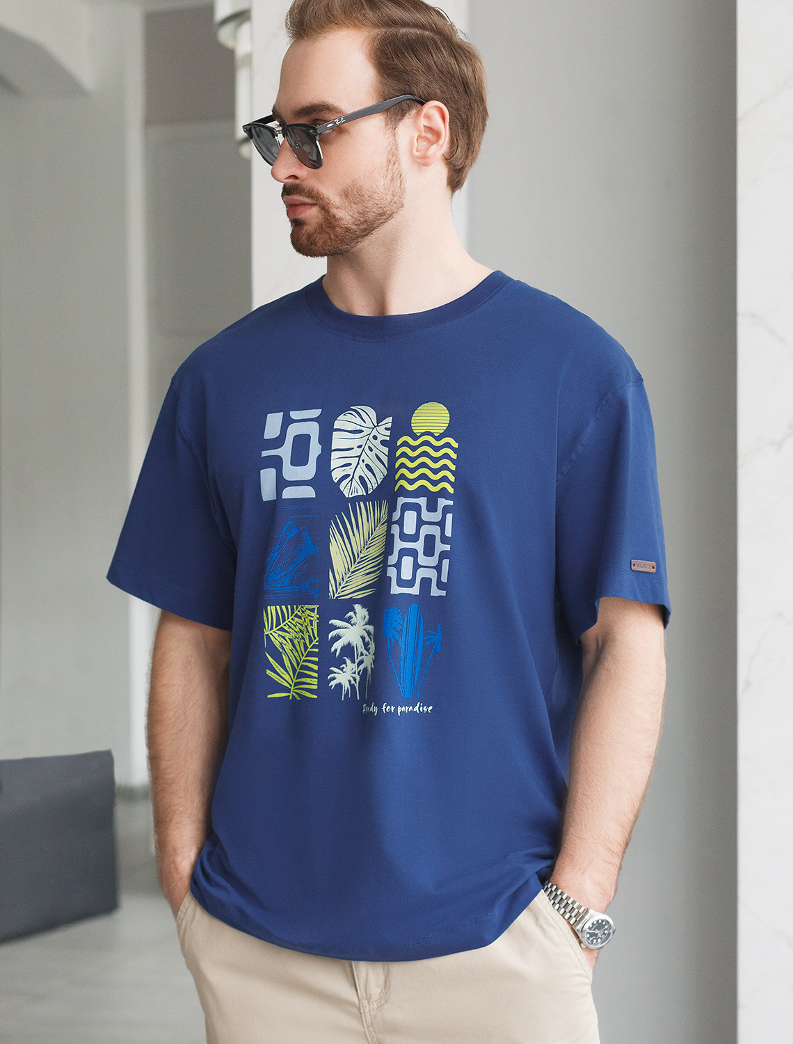 Перевод принта: Ready for paradise - готов к райскому отдыху. Футболка свободного кроя выполнена из премиального хлопка. Авторский принт нанесен красками с устойчивым покрытием. Благодаря эластану, носить изделие очень комфортно, и оно сохранит свой безупречный вид в течение долгого времени. На рукаве нашивка из эко-кожи с логотипом бренда.