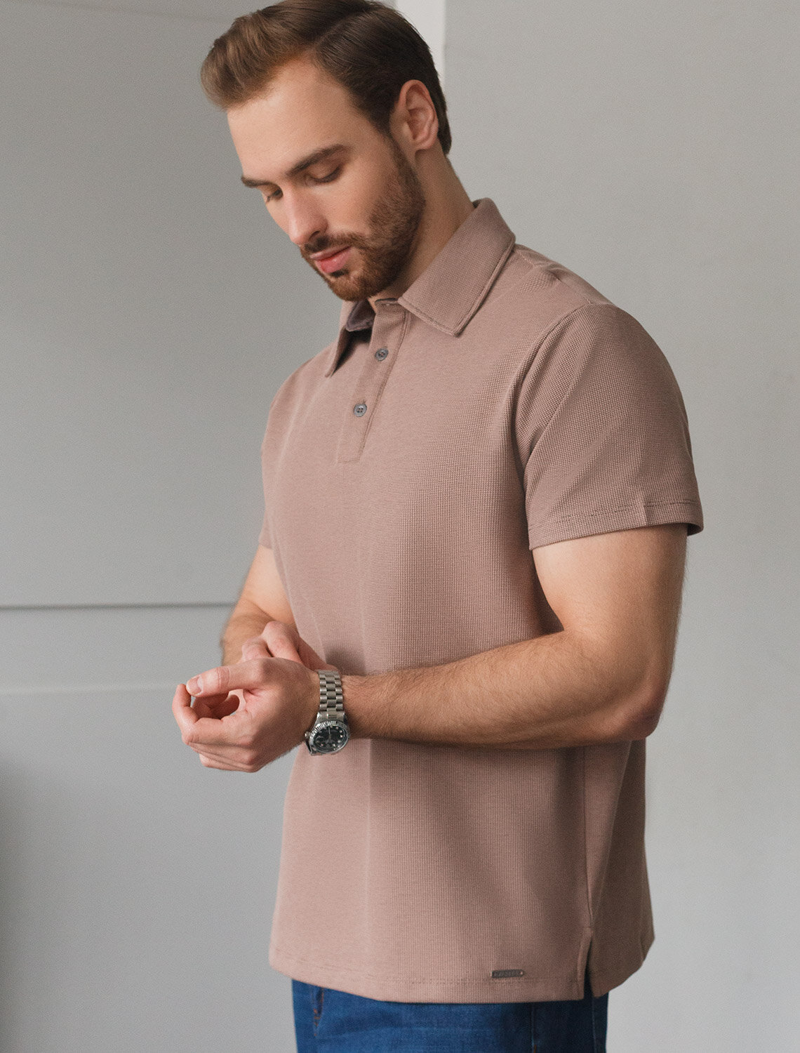 Футболка-поло выполнена из фактурного трикотажа. Однотонная модель с контрастной планкой и металлическими пуговицами с логотипом бренда. Эластичный хлопковый материал хорошо пропускает воздух и комфортно облегает фигуру. В таком изделии не будет жарко даже в самое теплое время года.