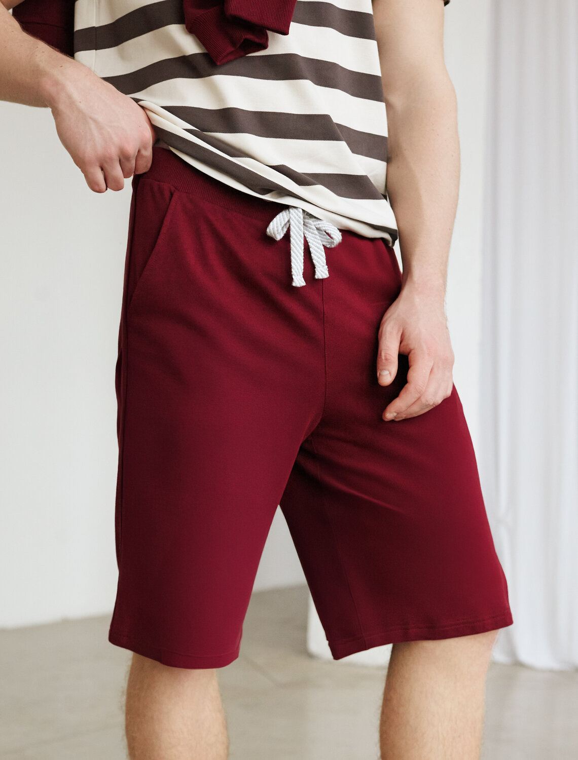 Спортивные шорты с карманами сшиты из премиального облегченного футера. Трикотажное хлопковое полотно приятное к телу пропускает воздух и позволяет коже дышать. Изделие хорошо держит форму, не вытягивается, не стесняет движений и идеально подходит для занятий спортом и отдыха.