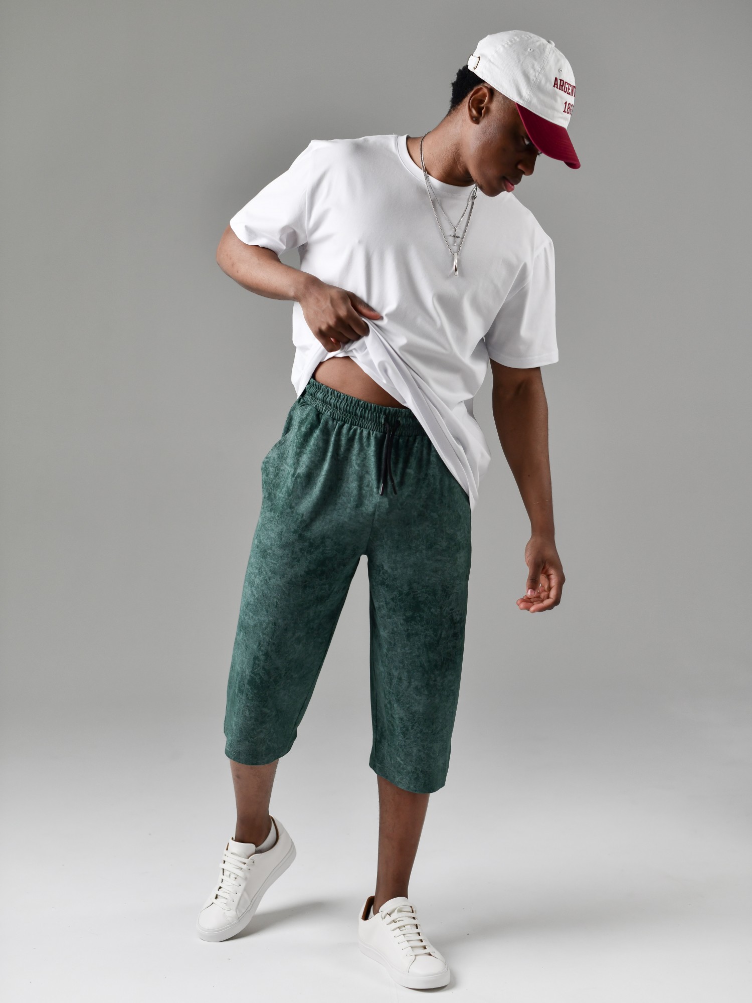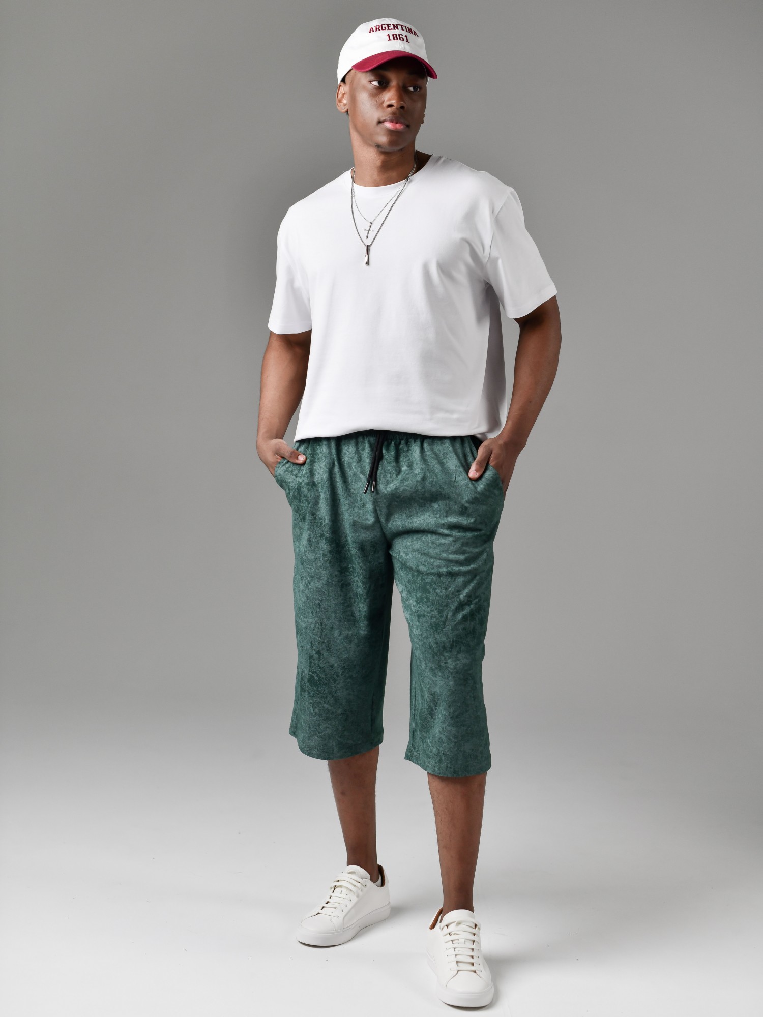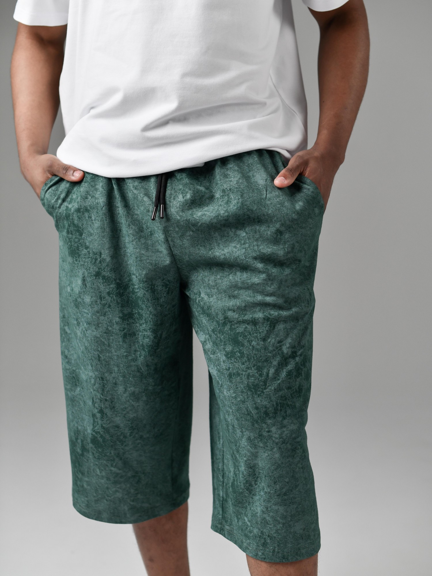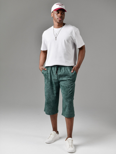 Шорты мужские из трикотажного полотна "кулирка" с набивным рисунком, удлиненные, на притачном поясе с эластичной тесьмой внутри, с карманами в боковых швах, входы в которые окантованы основным материалом.