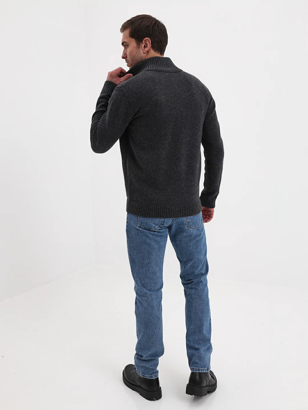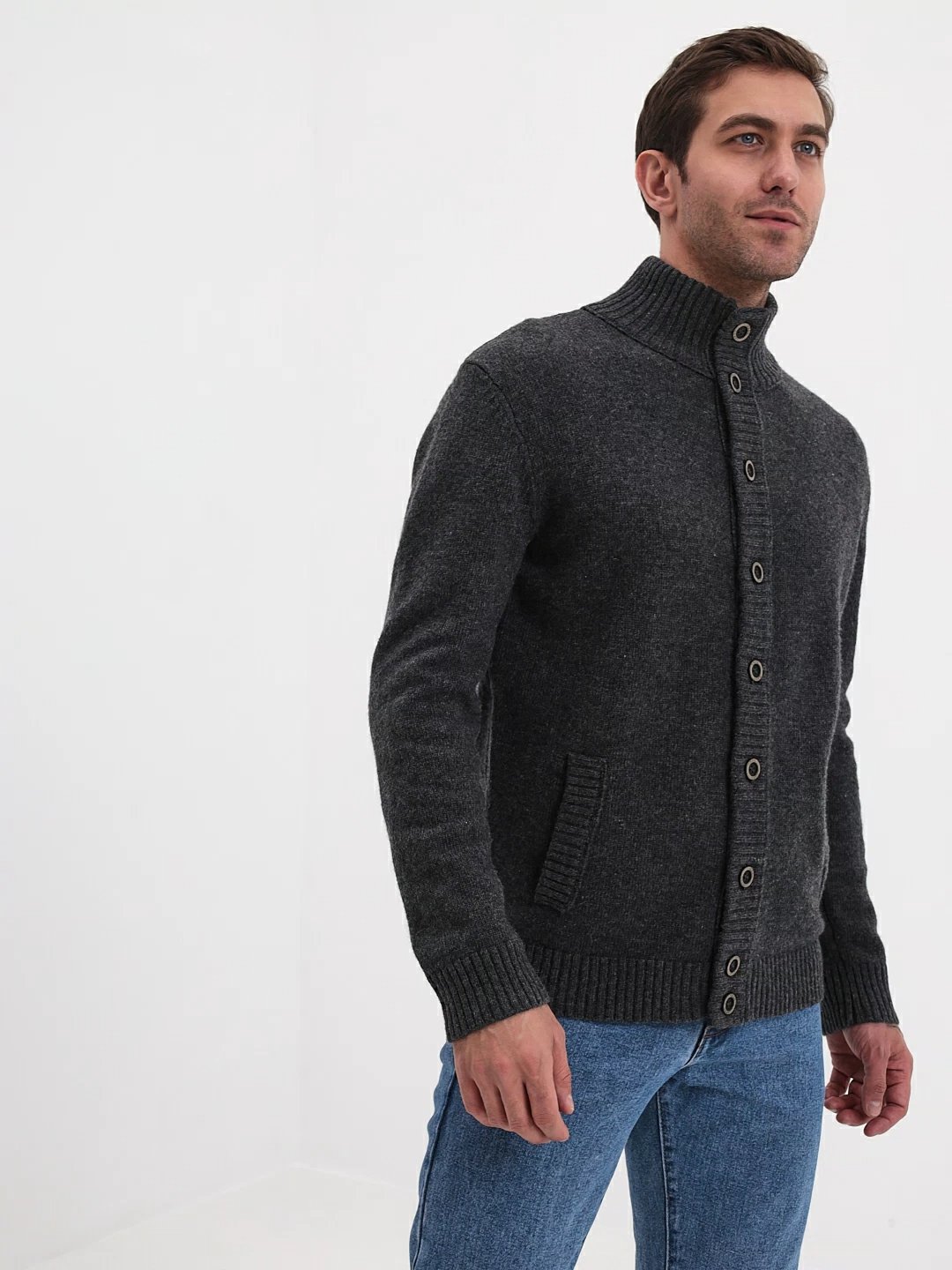 Цвет: Серый Рисунок: Трикотаж одн..показатьотонный Состав: 80% шерсть мериноса 20% акрил Модель: Классическая Ворот: Кардиган на пуг. с отложным воротникомотонный