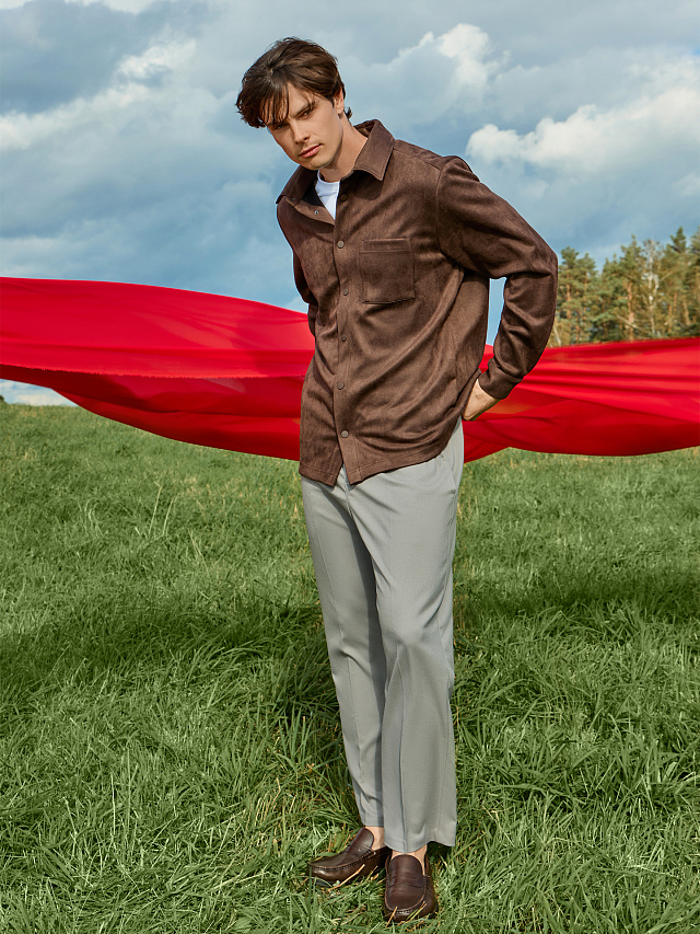 Жакет мужской коричневый — это универсальная модель, сочетающая элегантность пиджака и комфорт плотной рубашки. Свободный прямой силуэт со спущенным плечом обеспечивает свободу движений, а трикотажный материал «под замшу» создает эффект премиум-текстуры.