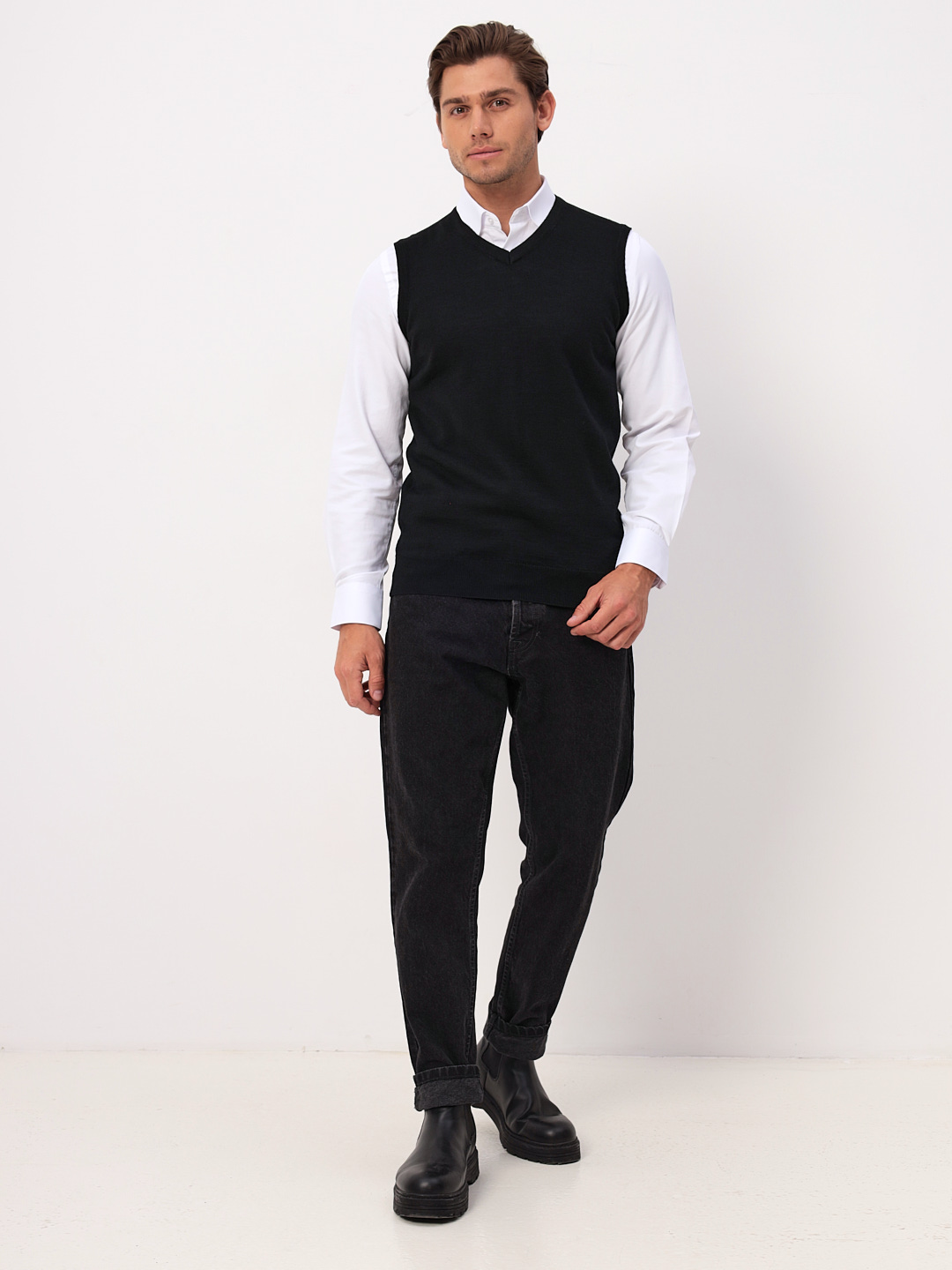 Цвет: Черный Рисунок: Трикотаж од..показатьнотонный Состав: 80% шерсть мериноса 20% акрил Модель: Классическая Ворот: Жилет V-вырез Силуэт: Прямой силуэт / Сlassic fitнотонный