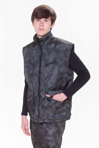 Жилет прямого силуэта, с воротником - стойкой, с центральной бортовой застёжкой на молнию.