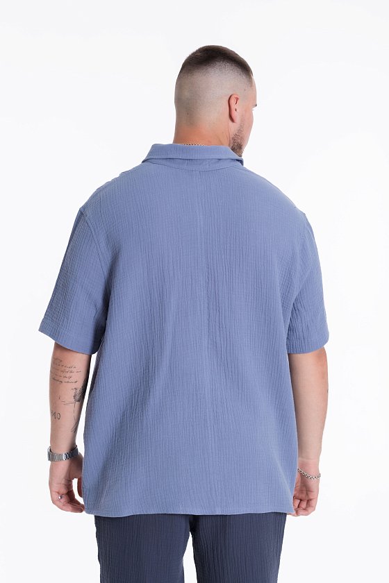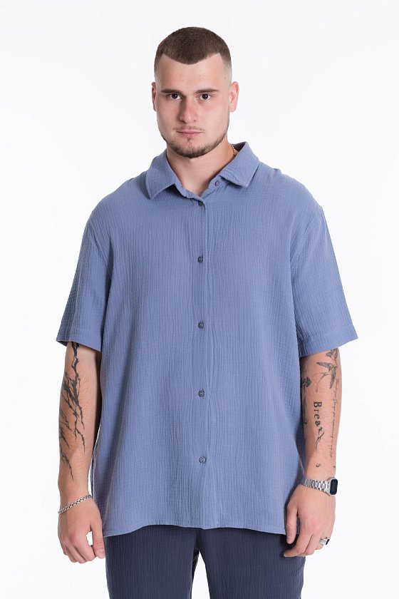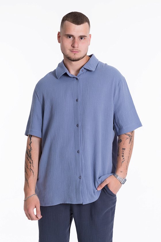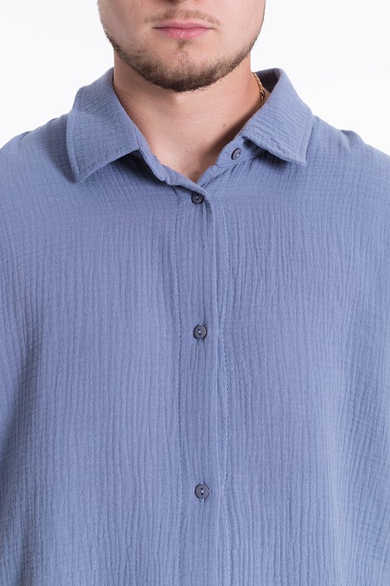 Мужская рубашка из полотна "муслин". Ворот, втачной короткий рукав, свободный крой, застежка спереди на пуговицы.