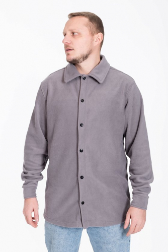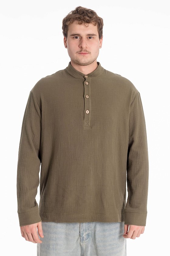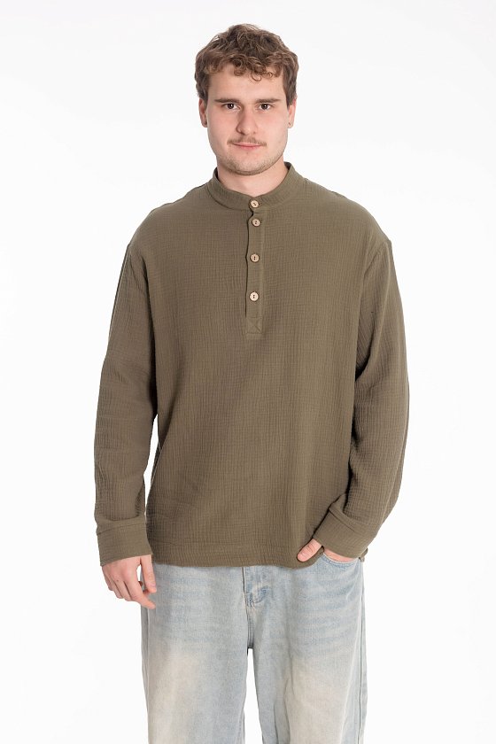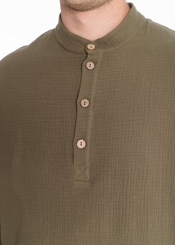Мужская рубашка с длинным рукавом и спущенной линией плеча выполнена из муслина. Воротник-стойка, короткая застежка на пуговицы, внизу по бокам декоративные разрезы.