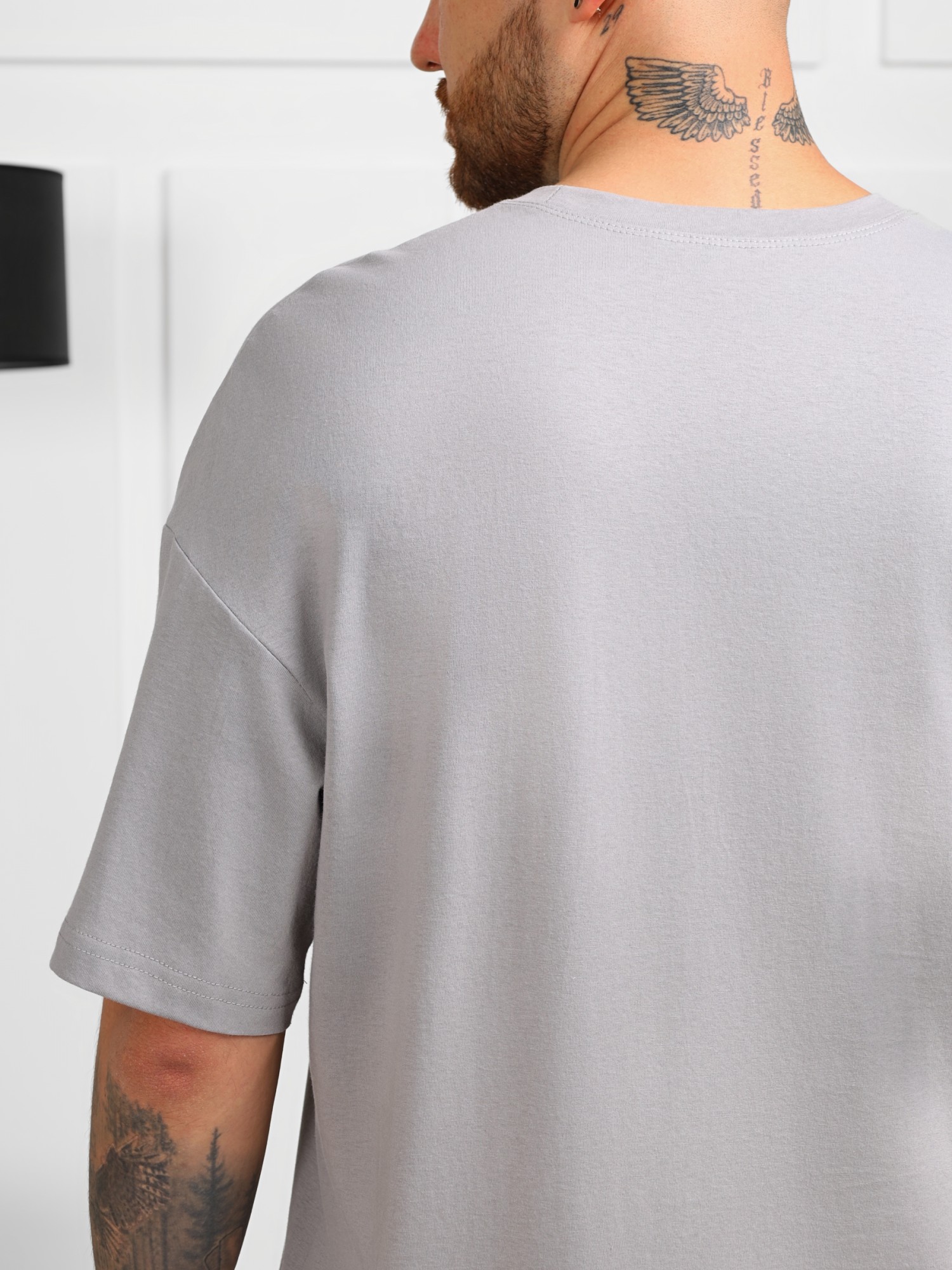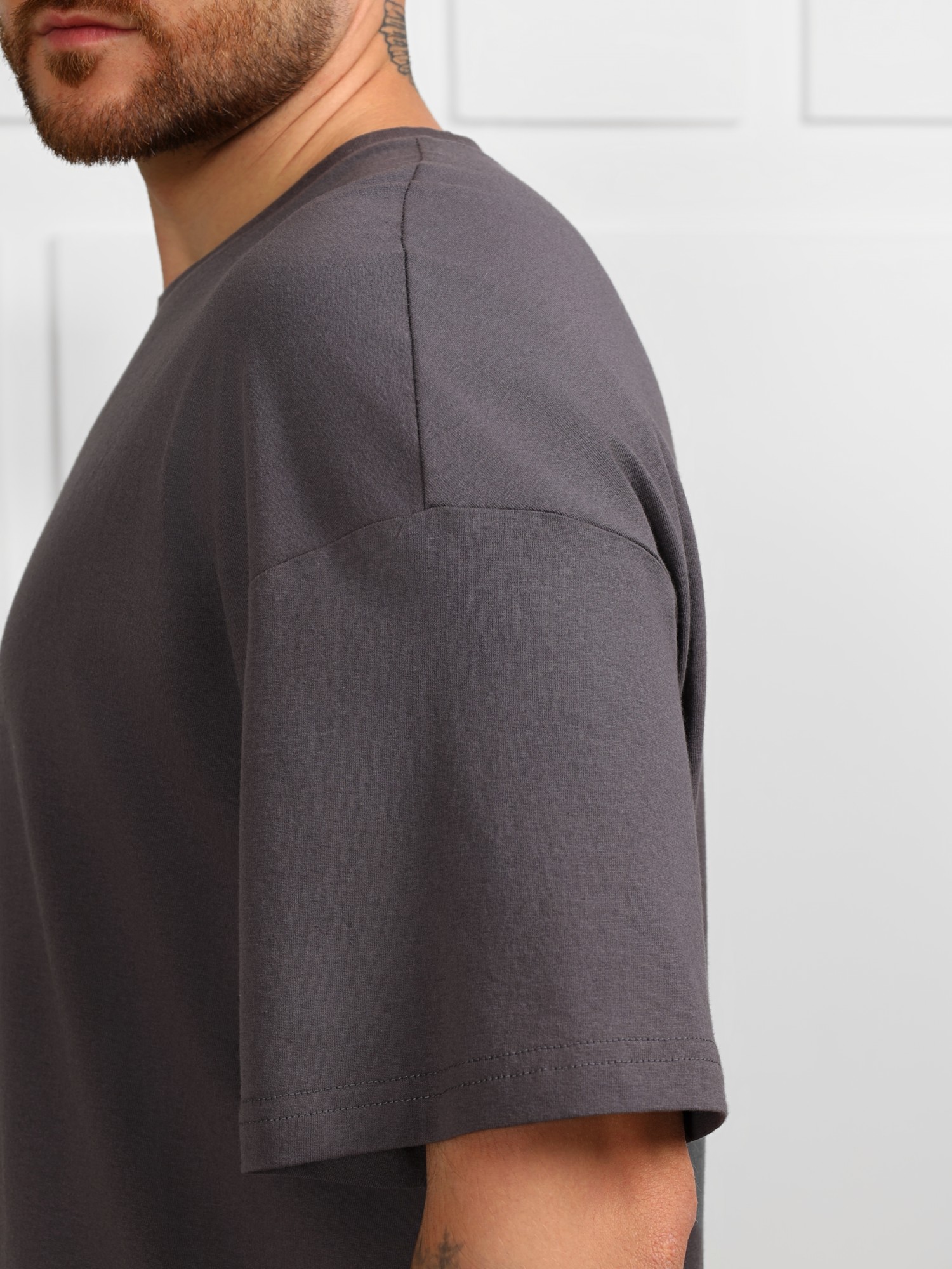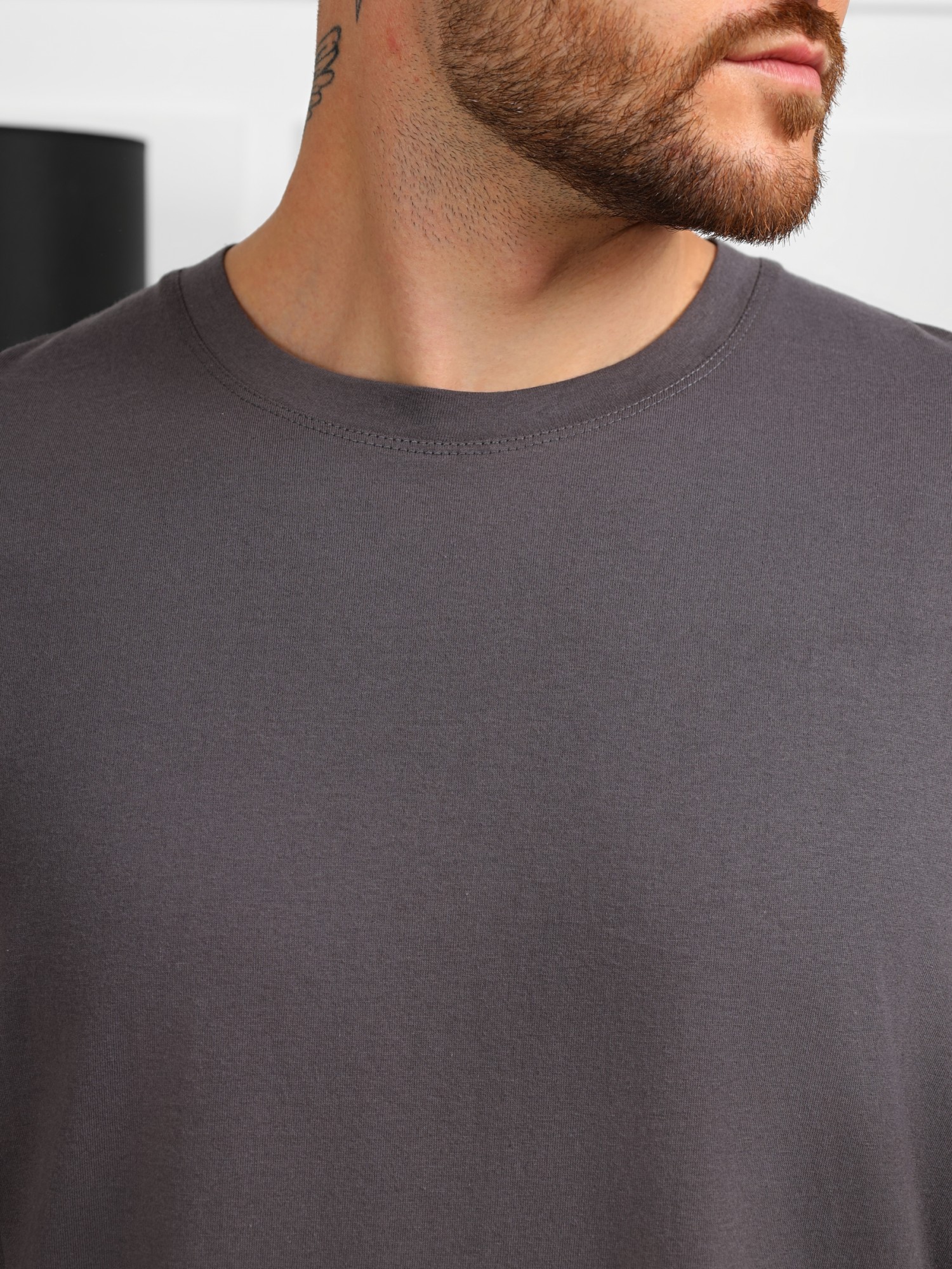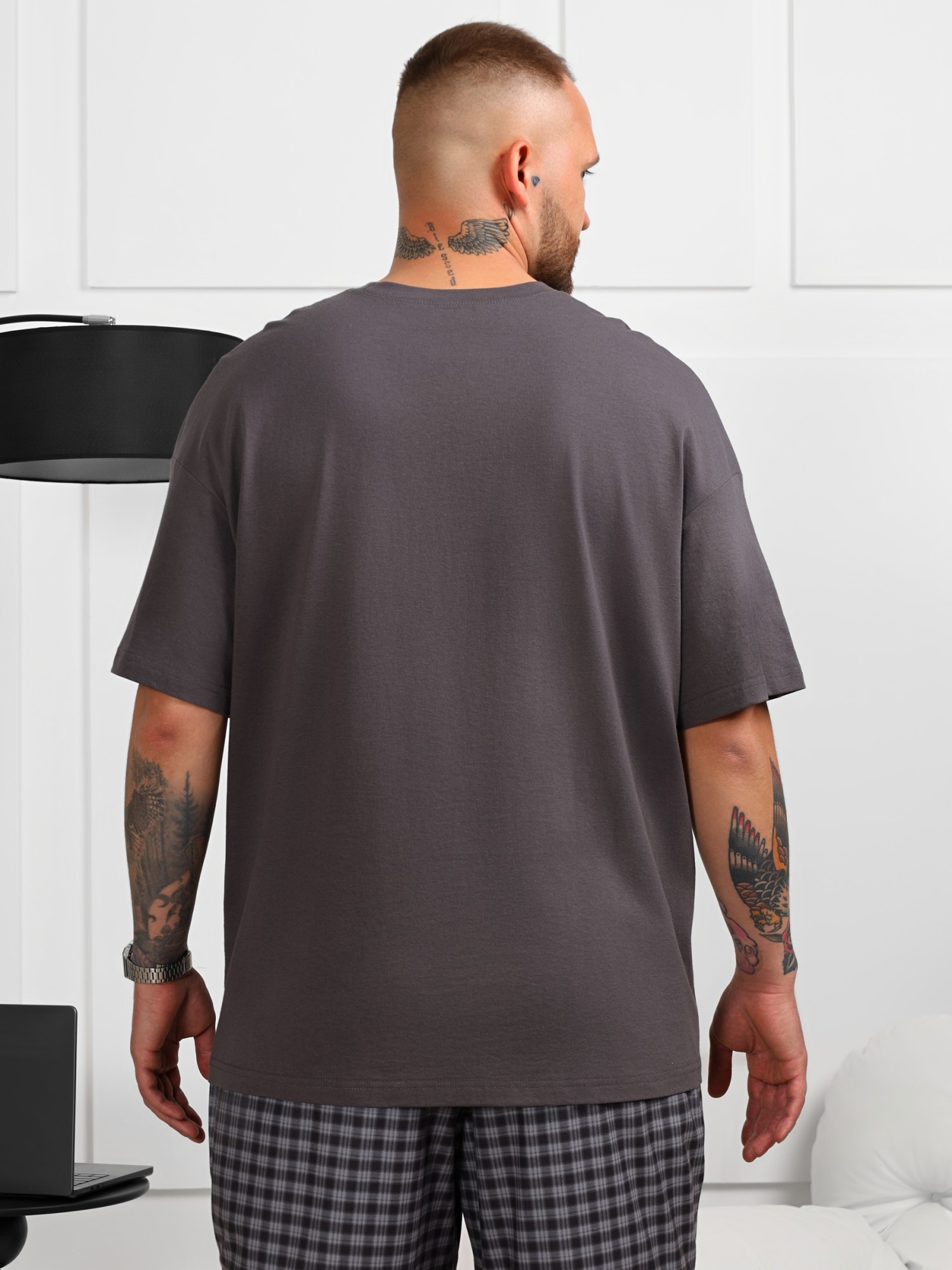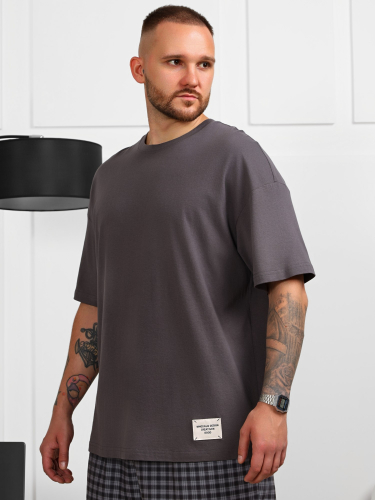 Футболка мужская из трикотажного полотна кулирного переплетения. Модель со спущенной линией плеч, втачными короткими рукавами, горловиной овальной формы, обработанной втачной планкой, и с декоративной нашивкой в нижней части детали переда.