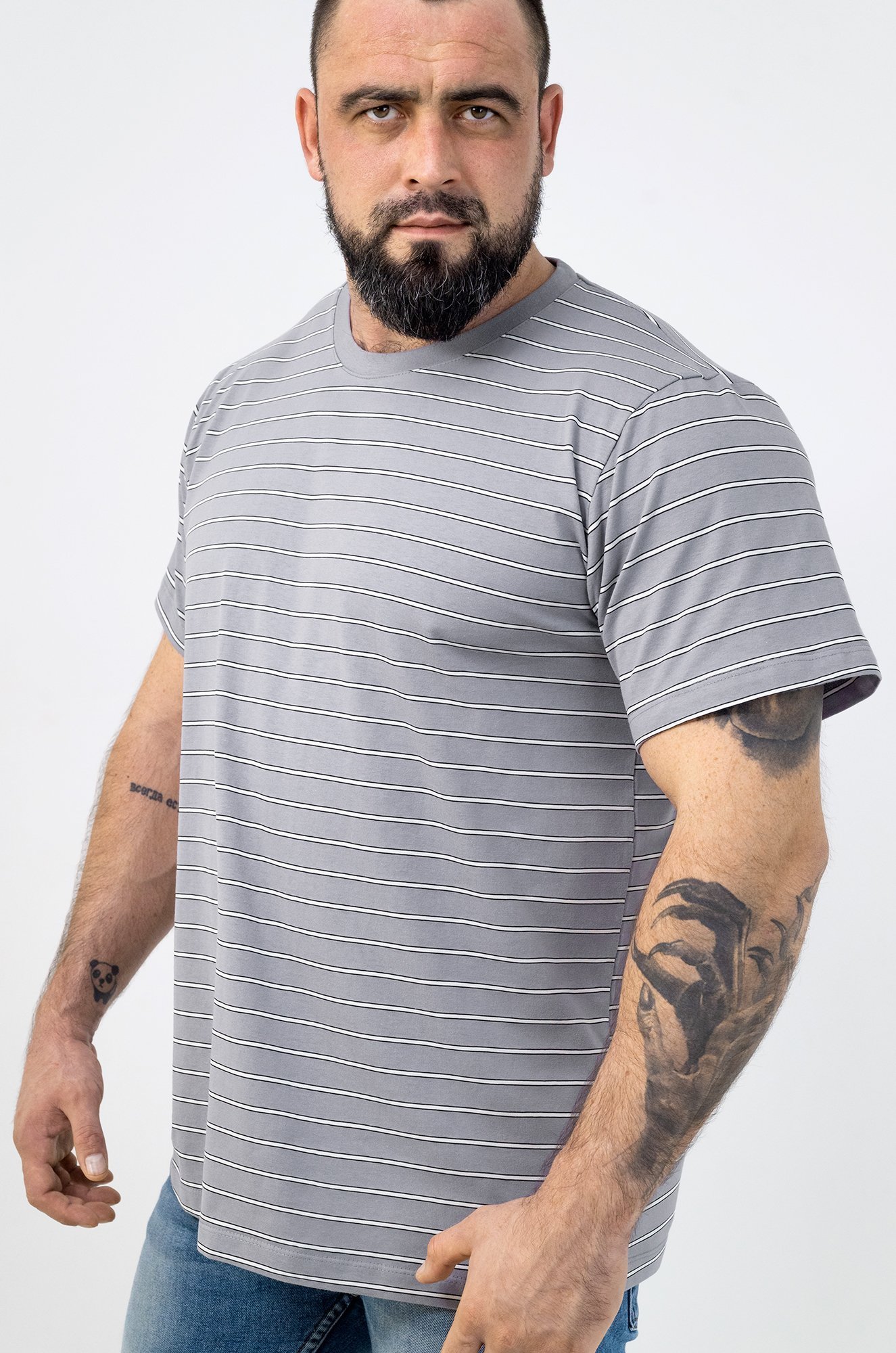 Серая футболка в полоску подходит для мужчин, ценящих удобство и простоту. Хлопковая основа и шелковистая структура трикотажа дарят комфорт и аккуратный внешний вид.