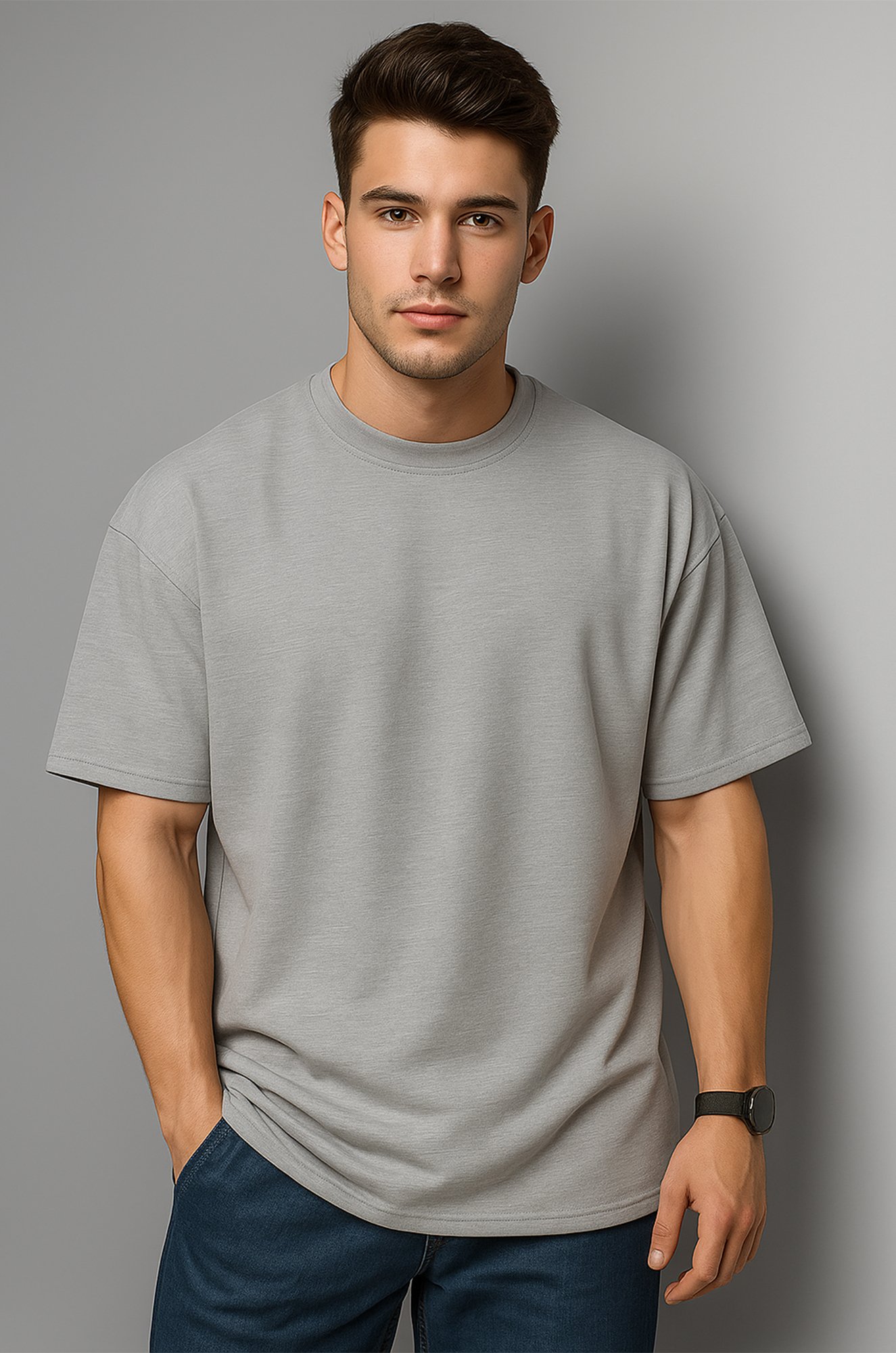 Однотонная серая футболка для мужчин подойдёт для прогулок, встреч с друзьями или активного отдыха.