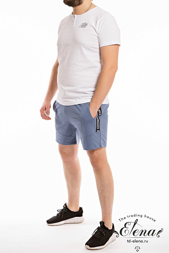 Шорты из футер петли с лайкрой, по бокам два кармана. Параллельно боковому шву, рядом с карманами настрочена отделочная резинка. Сзади расположен накладной карман. Пояс на резинке и шнуре.