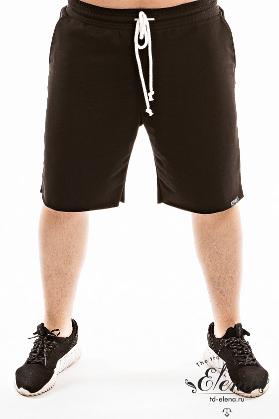 Шорты из однотонного футера с лайкрой. Пояс притачной, через петли продёрнут шнур. По бокам размещены карманы. Низ шорт не обработан, на левой стороне декоративная нашивка.