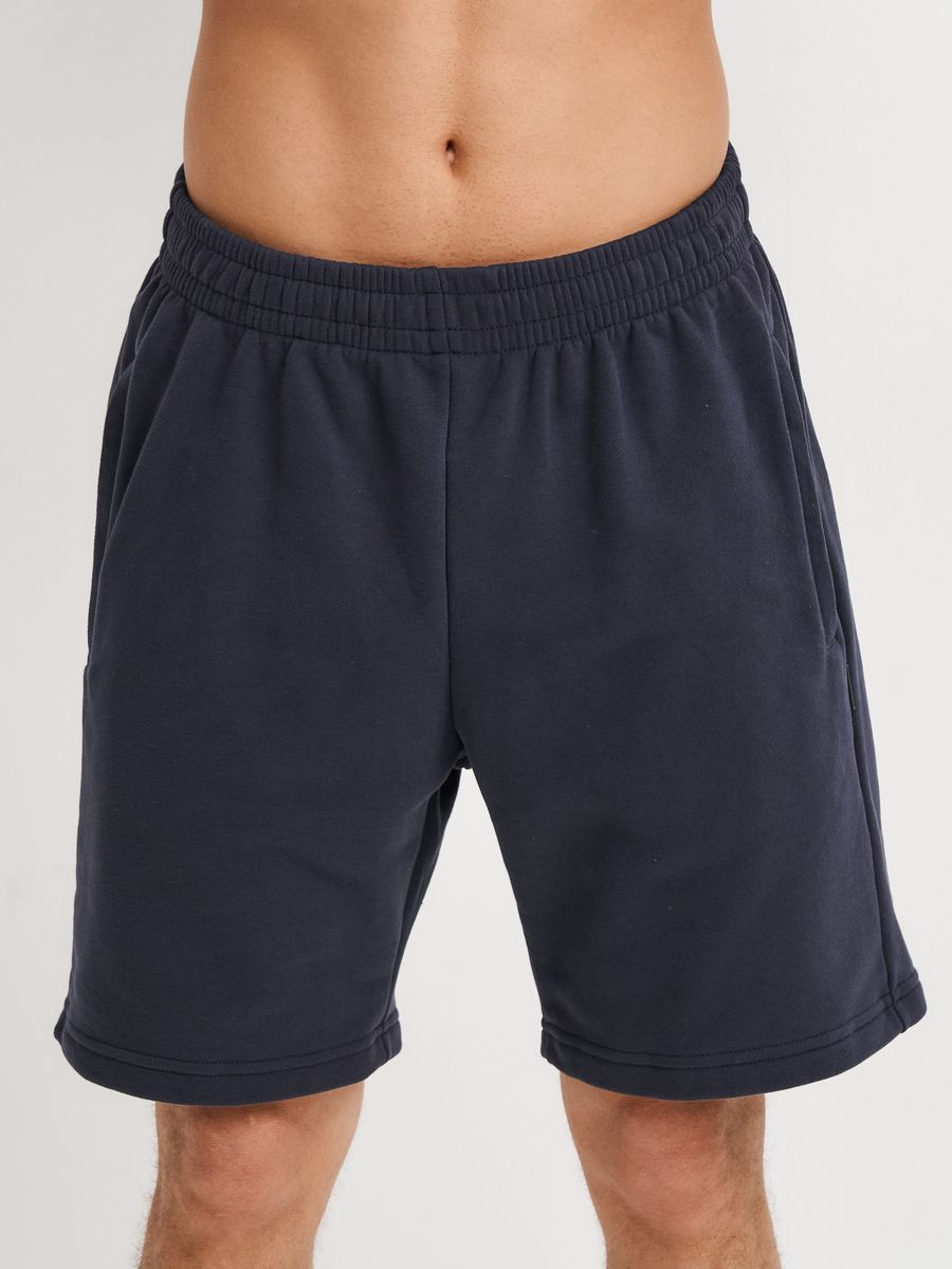 Мужские шорты из футера 3-х нитки с эффектом бархат, прямые, с цельнокроеным поясом, строчёным с эластичной тесьмой. С внутренней стороны пояса петли, через которые продет шнур. два передних и один задний карман с листочками на молниях.