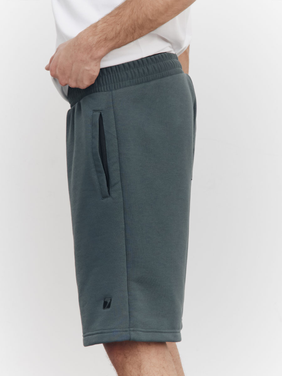 Мужские шорты из футера 3-х нитка петля, с отрезным поясом, строчёным с эластичной тесьмой. С изнаночной стороны пояса петли, через которые продет шнур. Боковые карманы прорезные с листочками на молниях. На левой половинке шорт – имитация гульфика. На правой задней половинке шорт – накладной карман. Низ шорт подшит на плоскошовной машине.