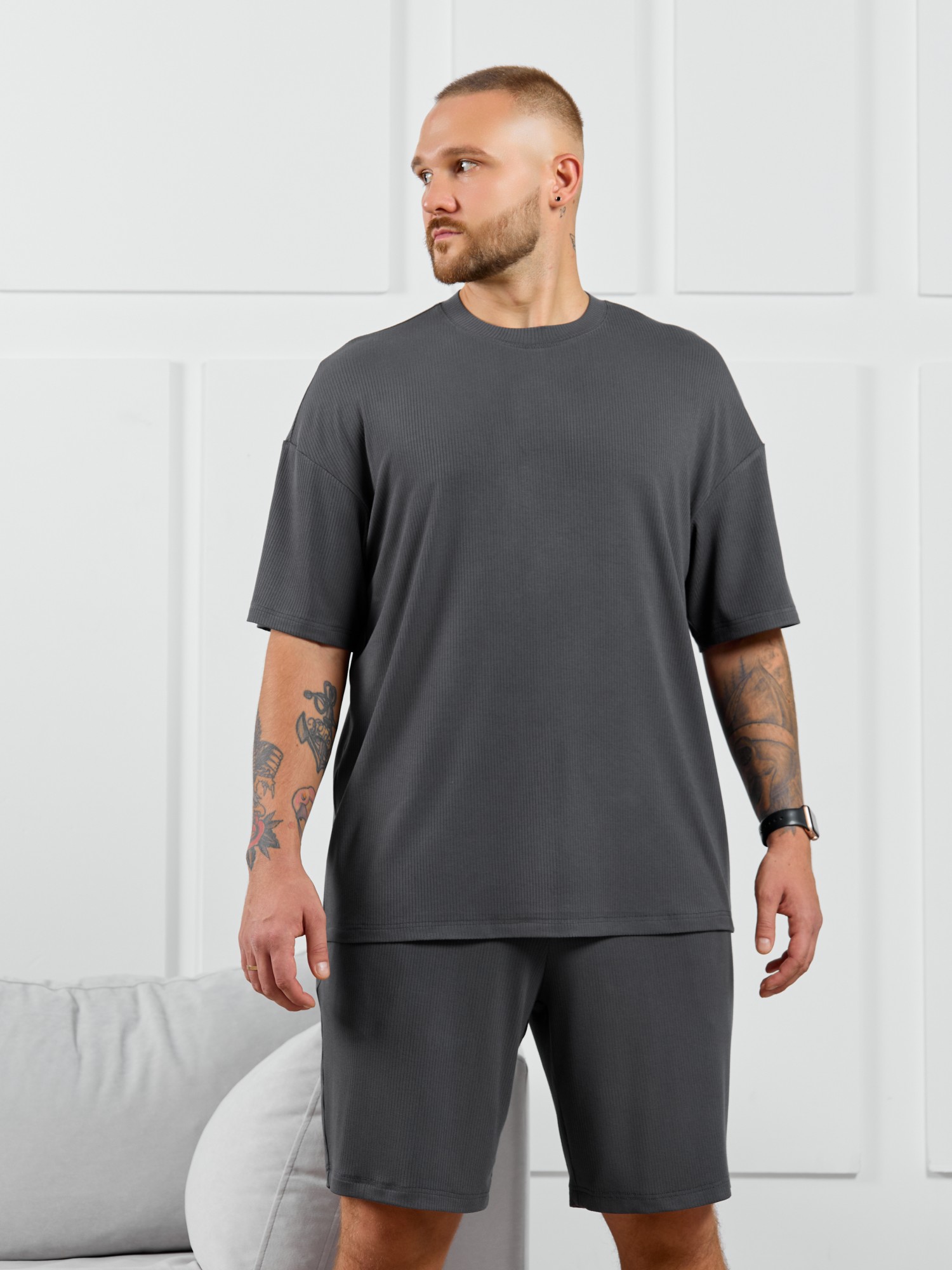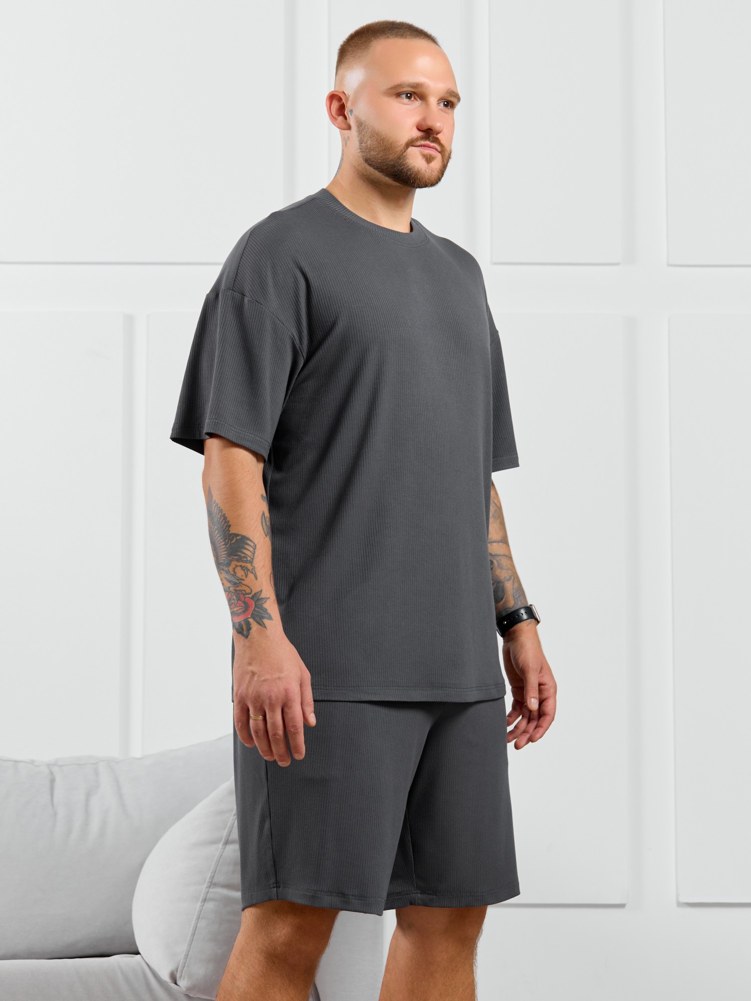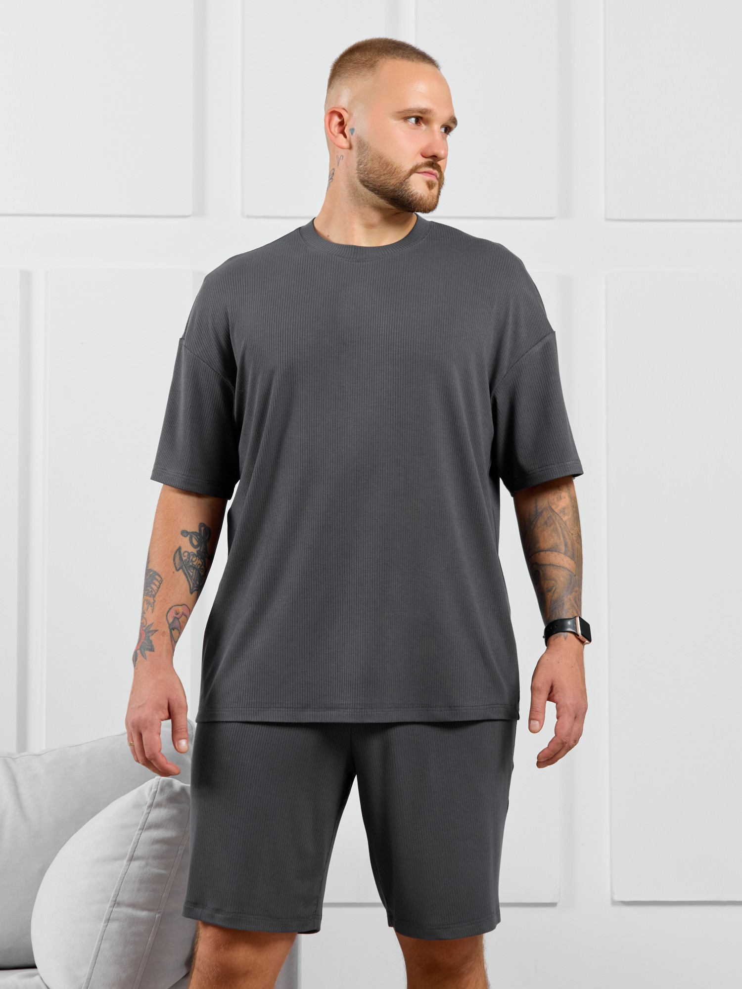 Шорты мужские из пластичного однотонного трикотажного полотна в рубчик, приятного к телу. Модель свободная, с боковыми карманами с обтачными входами, на притачном поясе с отстроченной эластичной тесьмой.