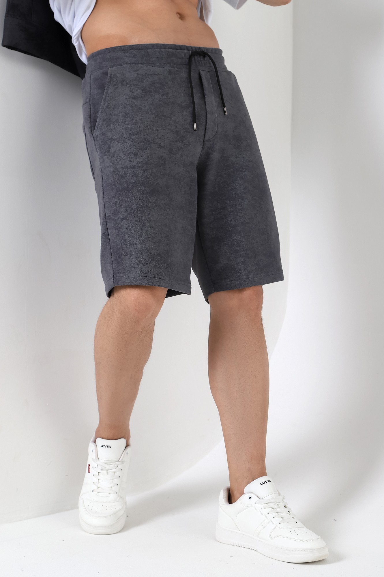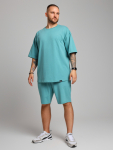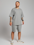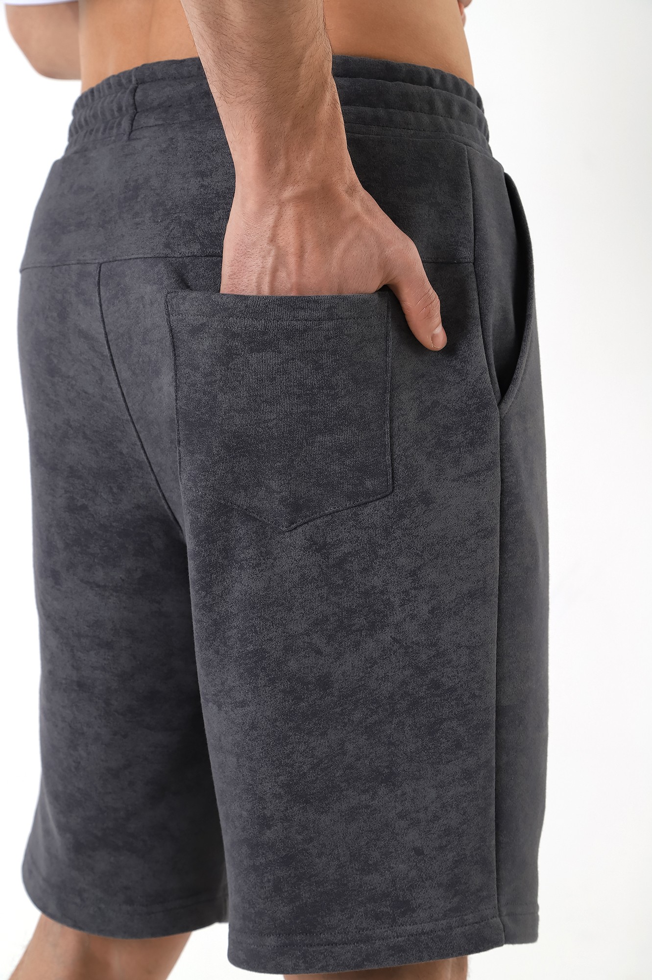 Шорты мужские из трикотажного полотна "футер-трехника -петля", на притчном поясе с эластичной тесьмой внутри, с карманами в боковых швах и имитацией застежки "гульфик". В центре пояса - две обметанные петли, чере которые продет шнурок с наконечниками для регулирования степени прилегания шорт по талии.