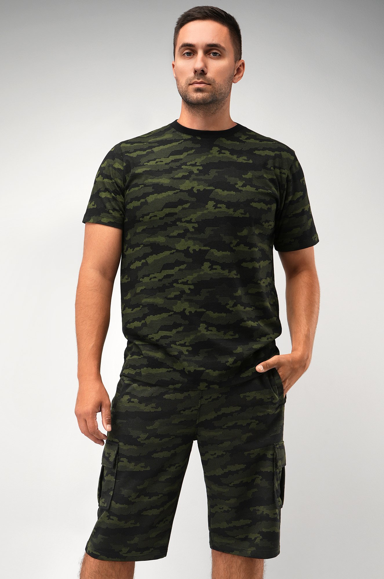 Футболка классического кроя выполнена из супрема. Удлиненные шорты карго выполнены из футера и дополнены внутренними и накладными карманами по бокам. Мягкий шнурок помогает регулировать посадку, а эластичная резинка в поясе нежно прилегает к телу.