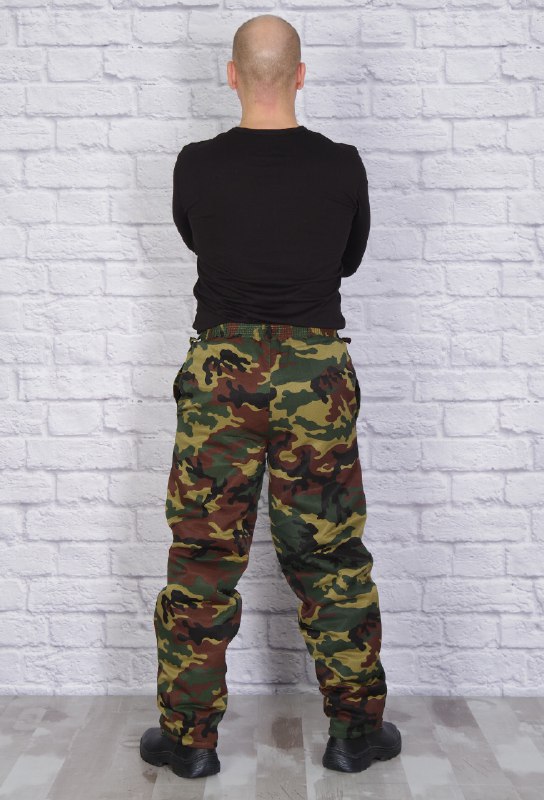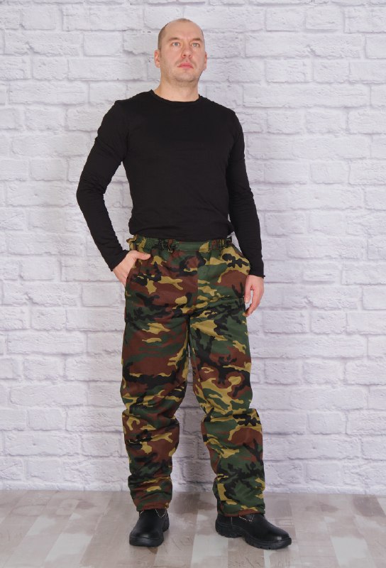 Утепленные брюки прямого кроя, пояс на широкой резинке, со шлевками для ремня, два боковых кармана.