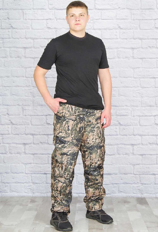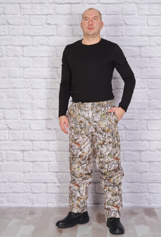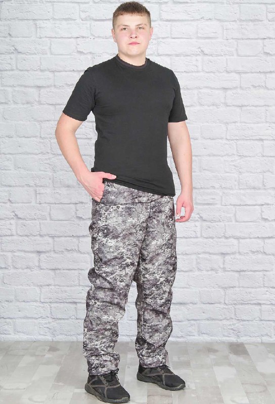 Прямые утепленные брюки на эластичной тесьме, со шлевками для ремня, имеют два боковых кармана.