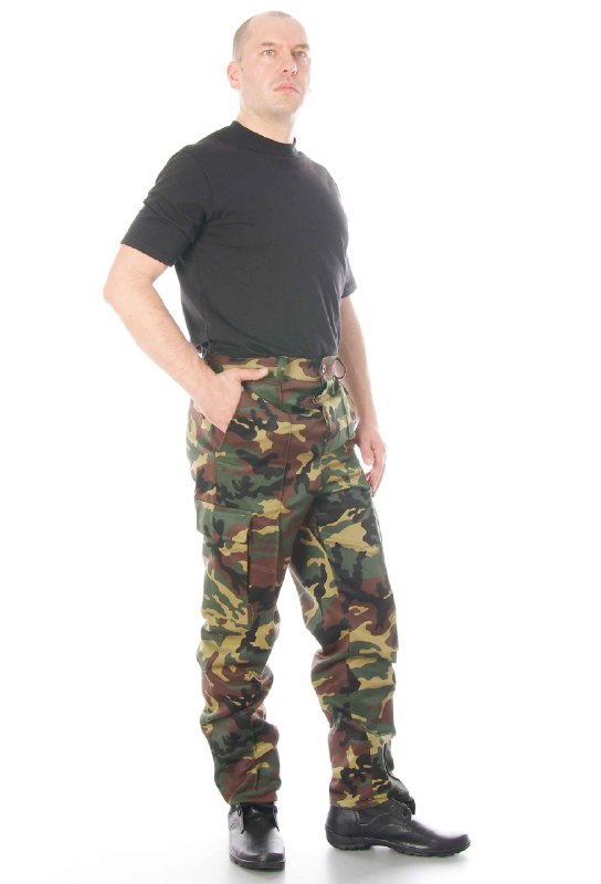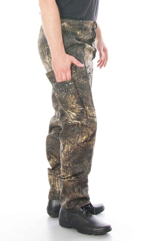 Удобные брюки для охотников и рыбаловов из ткани грета. Модель прямая, с застроченными "стрелками", пояс спереди и гульфик на пуговицах, сзади широкая резинка, удобные боковые карманы и накладные по ноге, с клапаном на пуговицах.