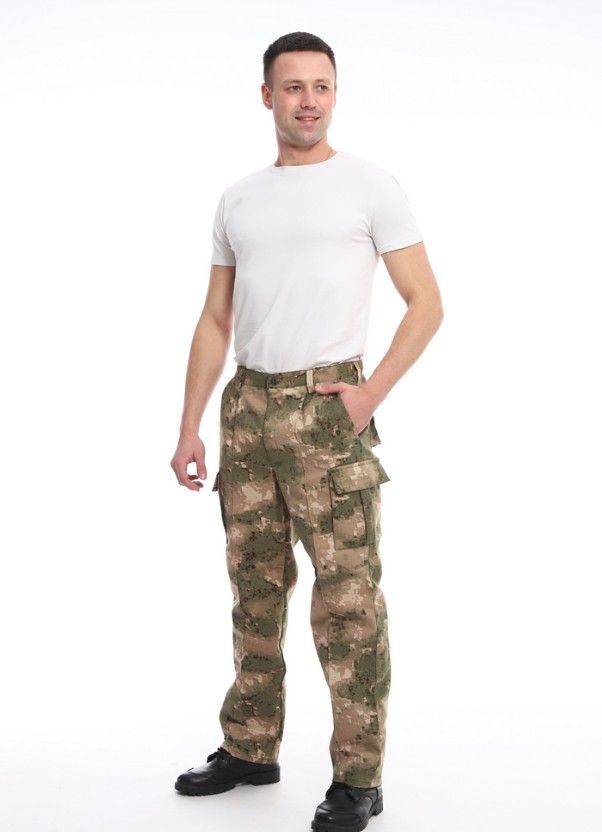 Ткань: твил; Состав: 65% хлопок, 35% вискоза; Сезонность: лето, всесезон; Стиль: милитари, рабочий; Праздники: 23 февраля; Застежка: пуговицы; Карман: с карманами; Тип изделия: брюки; Цвет: зеленыйкоричневый
