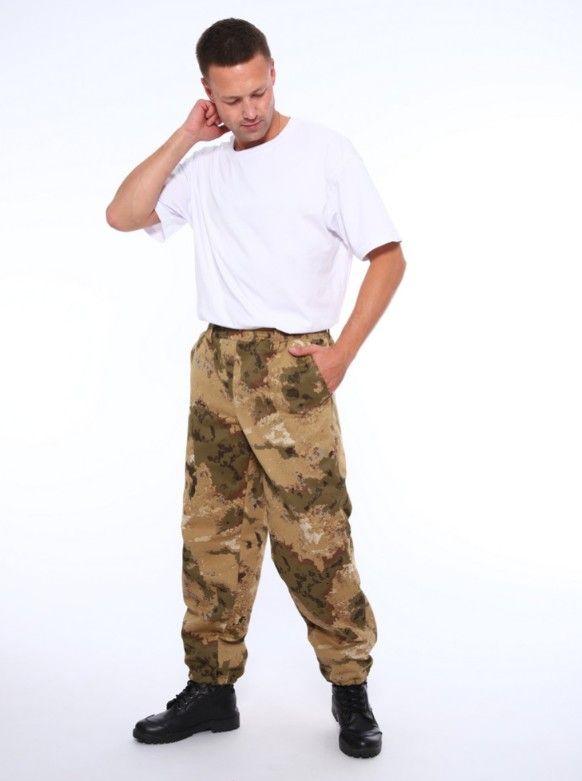 Ткань: твил; Состав: 65% хлопок, 35% вискоза; Сезонность: лето, всесезон; Стиль: милитари, рабочий; Праздники: 23 февраля; Застежка: без застежки; Карман: с карманами; Тип изделия: брюки; Цвет: бежевыйкоричневый