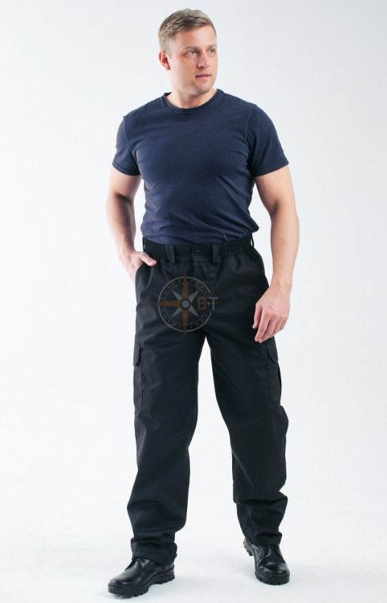 Ткань: твил; Состав: 35% хлопок, 65% п/э; Сезонность: лето, всесезон; Стиль: молодежный, повседневный, рабочий; Застежка: пуговицы, молния; Карман: с карманами; Производство: г. Иваново; Тип изделия: брюки; Цвет: черный